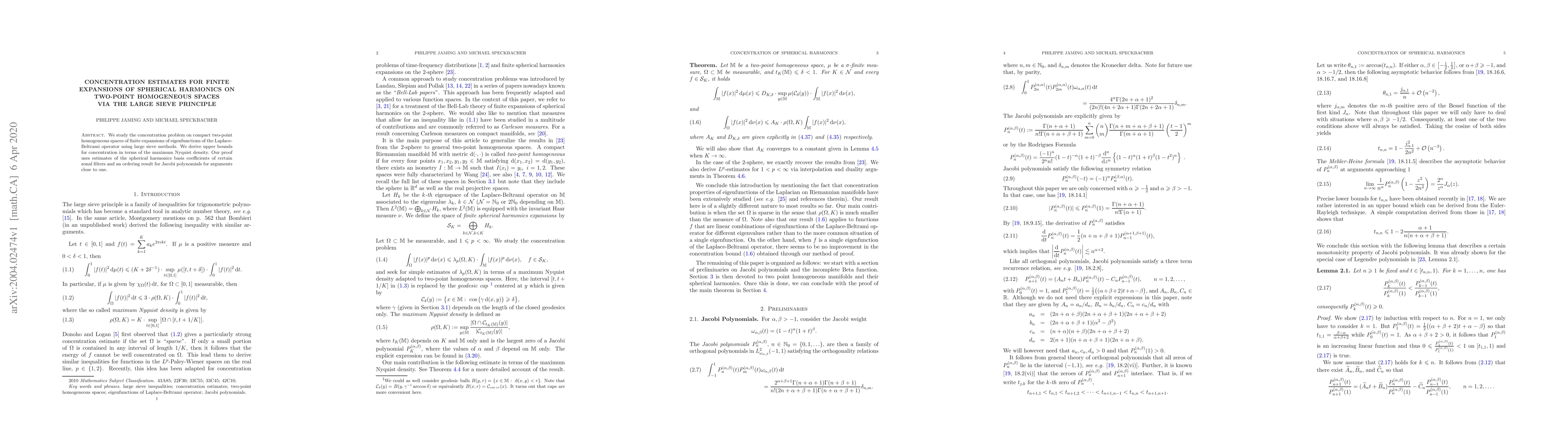 This paper investigates the concentration of finite expansions of spherical harmonics on compact two-point homogeneous spaces, employing large sieve methods to derive upper bounds linked to the maximum Nyquist density. The proof leverages estimates of spherical harmonics and an ordering result for Jacobi polynomials.