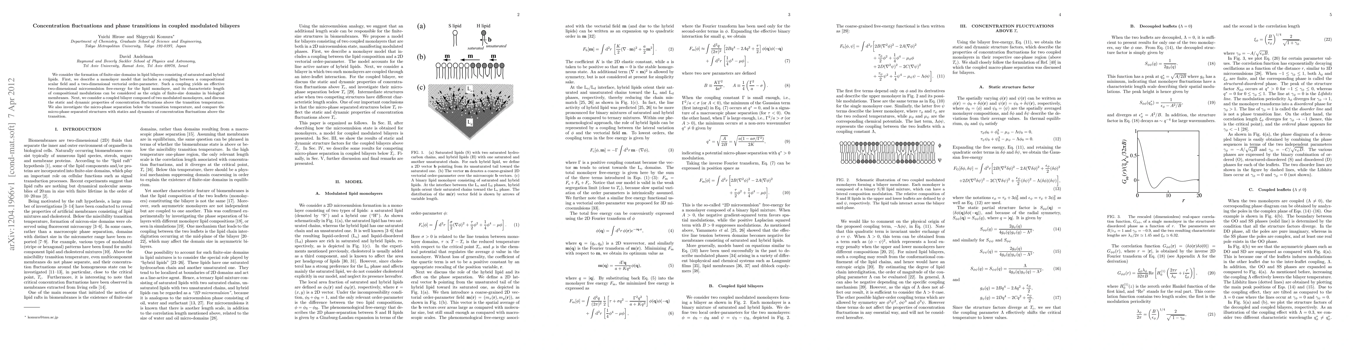 We consider the formation of finite-size domains in lipid bilayers consisting of saturated and hybrid lipids. First, we describe a monolayer model that includes a coupling between a compositional scalar field and a two-dimensional vectorial order-parameter. Such a coupling yields an effective two-dimensional microemulsion free-energy for the lipid monolayer, and its characteristic length of compositional modulations can be considered as the origin of finite-size domains in biological membranes. Next, we consider a coupled bilayer composed of two modulated monolayers, and discuss the static and dynamic properties of concentration fluctuations above the transition temperature. We also investigate the micro-phase separation below the transition temperature, and compare the micro-phase separated structures with statics and dynamics of concentration fluctuations above the transition.