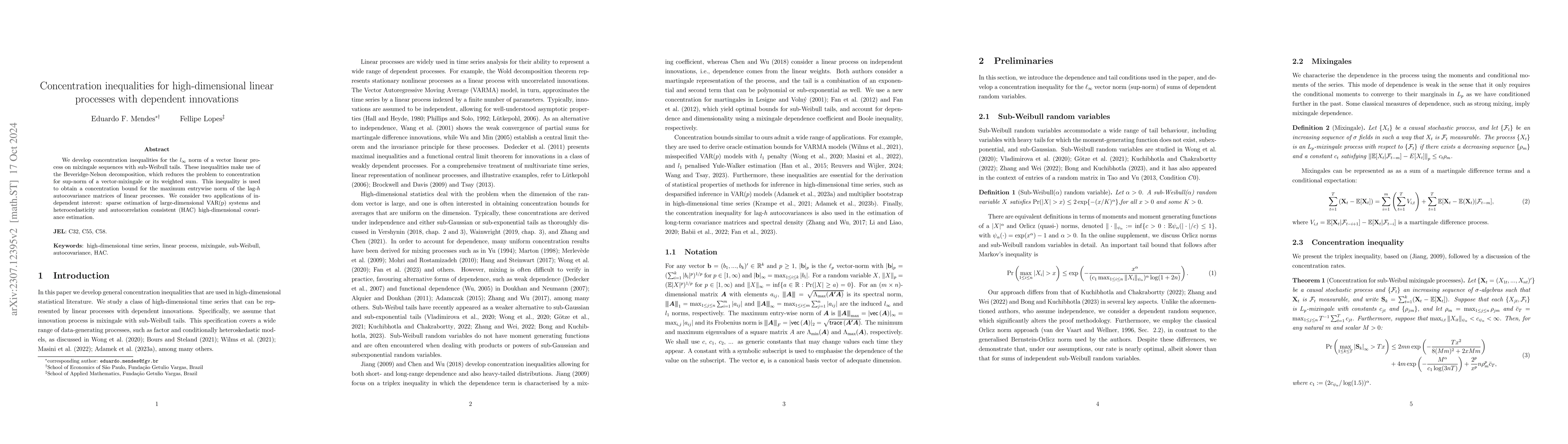 We develop concentration inequalities for the $l_\infty$ norm of a vector linear processes on mixingale sequences with sub-Weibull tails. These inequalities make use of the Beveridge-Nelson decomposition, which reduces the problem to concentration for sup-norm of a vector-mixingale or its weighted sum. This inequality is used to obtain a concentration bound for the maximum entrywise norm of the lag-$h$ autocovariance matrices of linear processes. These results are useful for estimation bounds for high-dimensional vector-autoregressive processes estimated using $l_1$ regularisation, high-dimensional Gaussian bootstrap for time series, and long-run covariance matrix estimation.
