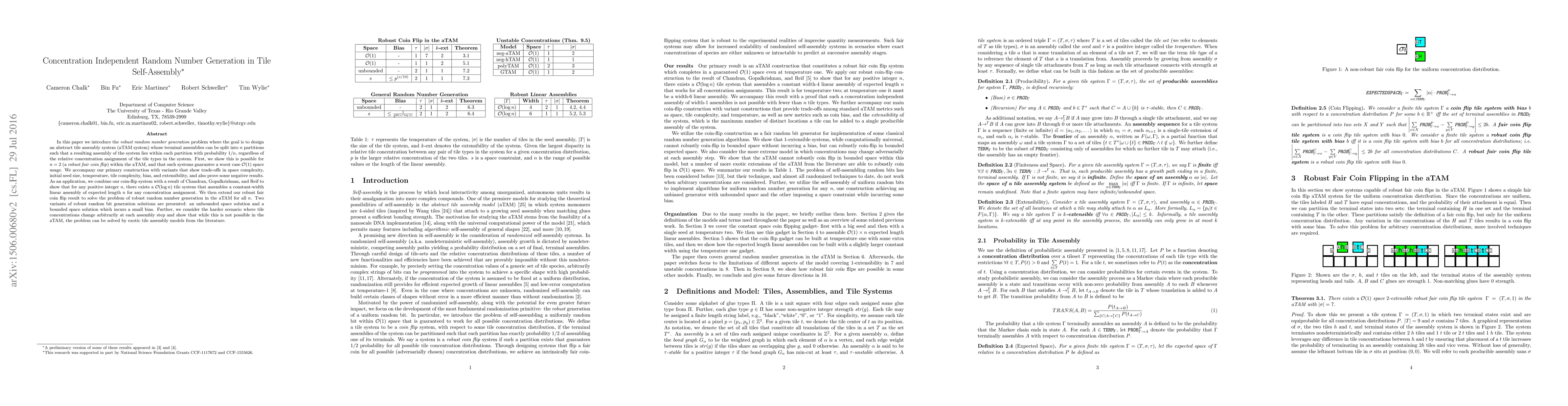 In this paper we introduce the \emph{robust random number generation} problem where the goal is to design an abstract tile assembly system (aTAM system) whose terminal assemblies can be split into $n$ partitions such that a resulting assembly of the system lies within each partition with probability 1/$n$, regardless of the relative concentration assignment of the tile types in the system. First, we show this is possible for $n=2$ (a \emph{robust fair coin flip}) within the aTAM, and that such systems guarantee a worst case $\mathcal{O}(1)$ space usage. We accompany our primary construction with variants that show trade-offs in space complexity, initial seed size, temperature, tile complexity, bias, and extensibility, and also prove some negative results. As an application, we combine our coin-flip system with a result of Chandran, Gopalkrishnan, and Reif to show that for any positive integer $n$, there exists a $\mathcal{O}(\log n)$ tile system that assembles a constant-width linear assembly of expected length $n$ for any concentration assignment. We then extend our robust fair coin flip result to solve the problem of robust random number generation in the aTAM for all $n$. Two variants of robust random bit generation solutions are presented: an unbounded space solution and a bounded space solution which incurs a small bias. Further, we consider the harder scenario where tile concentrations change arbitrarily at each assembly step and show that while this is not possible in the aTAM, the problem can be solved by exotic tile assembly models from the literature.