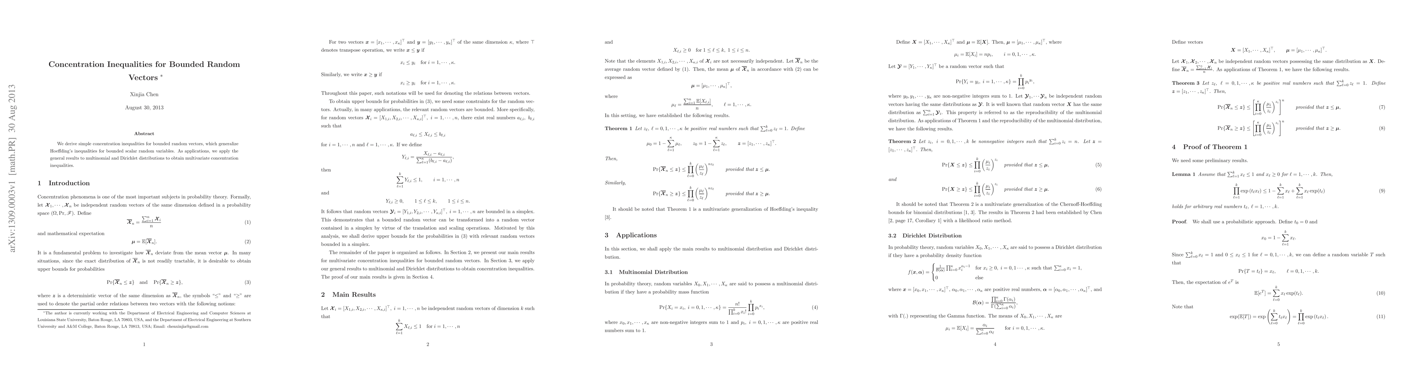 This paper derives concentration inequalities for bounded random vectors, extending Hoeffding's inequalities for scalars. It applies these results to multinomial and Dirichlet distributions, yielding multivariate concentration inequalities.