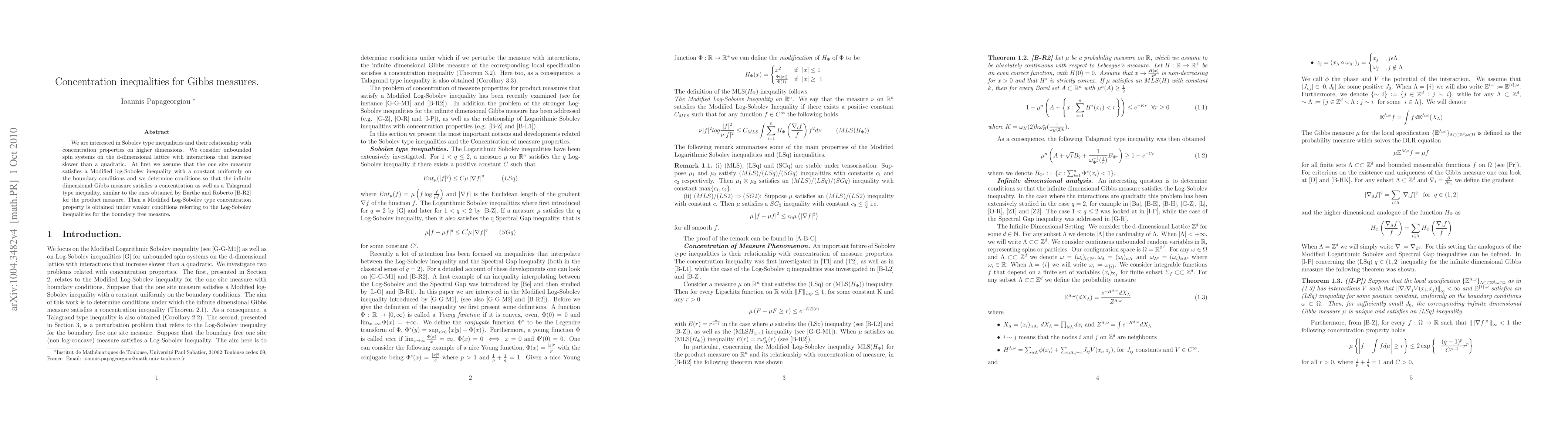 We are interested in Sobolev type inequalities and their relationship with concentration properties on higher dimensions. We consider unbounded spin systems on the d-dimensional lattice with interactions that increase slower than a quadratic. At first we assume that the one site measure satisfies a Modified log-Sobolev inequality with a constant uniformly on the boundary conditions and we determine conditions so that the infinite dimensional Gibbs measure satisfies a concentration as well as a Talagrand type inequality. Then a Modified Log-Sobolev type concentration property is obtained under weaker conditions referring to the Log-Sobolev inequalities for the boundary free measure.