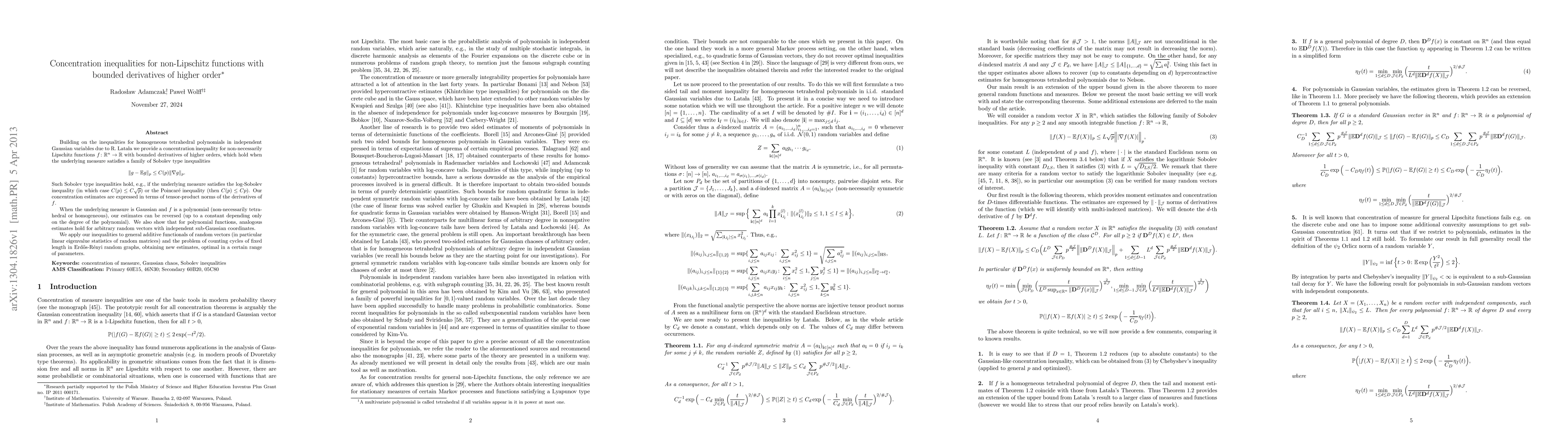 Building on the inequalities for homogeneous tetrahedral polynomials in independent Gaussian variables due to R. Lata{\l}a we provide a concentration inequality for non-necessarily Lipschitz functions $f\colon \R^n \to \R$ with bounded derivatives of higher orders, which hold when the underlying measure satisfies a family of Sobolev type inequalities $\|g- \E g\|_p \le C(p)\|\nabla g\|_p.$ Such Sobolev type inequalities hold, e.g., if the underlying measure satisfies the log-Sobolev inequality (in which case $C(p) \le C\sqrt{p}$) or the Poincar\'e inequality (then $C(p) \le Cp$). Our concentration estimates are expressed in terms of tensor-product norms of the derivatives of $f$. When the underlying measure is Gaussian and $f$ is a polynomial (non-necessarily tetrahedral or homogeneous), our estimates can be reversed (up to a constant depending only on the degree of the polynomial). We also show that for polynomial functions, analogous estimates hold for arbitrary random vectors with independent sub-Gaussian coordinates. We apply our inequalities to general additive functionals of random vectors (in particular linear eigenvalue statistics of random matrices) and the problem of counting cycles of fixed length in Erd\H{o}s-R{\'e}nyi random graphs, obtaining new estimates, optimal in a certain range of parameters.