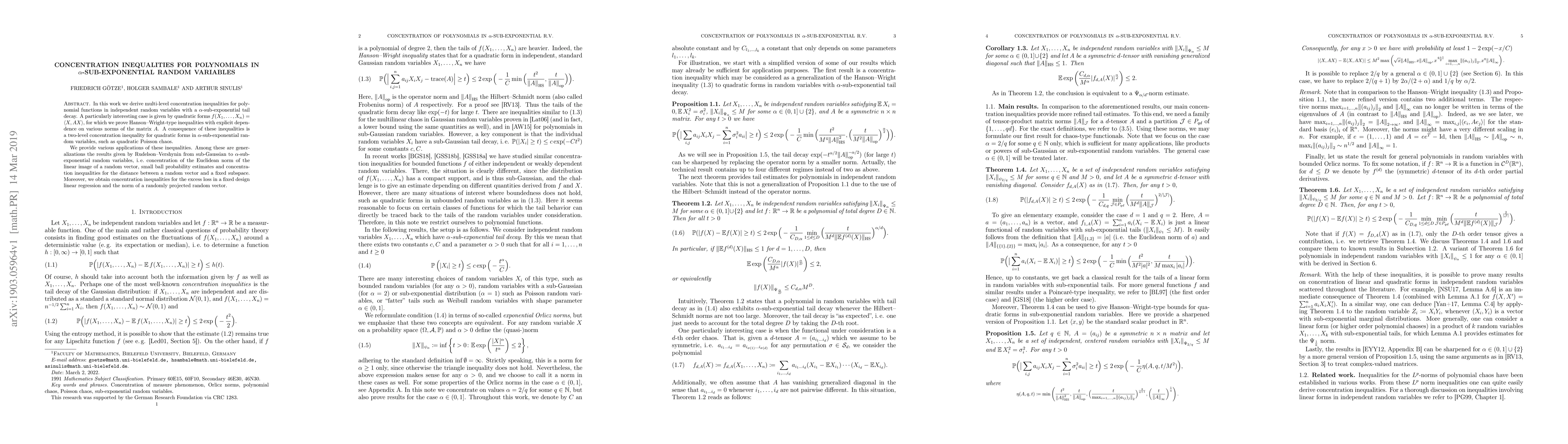 This paper derives multi-level concentration inequalities for polynomial functions in $\alpha$-sub-exponential random variables, focusing on quadratic forms and proving Hanson-Wright-type inequalities with explicit matrix norm dependencies. Applications include extending Rudelson-Vershynin's results from sub-Gaussian to $\alpha$-sub-exponential variables and deriving concentration inequalities for linear regression and projected random vectors.