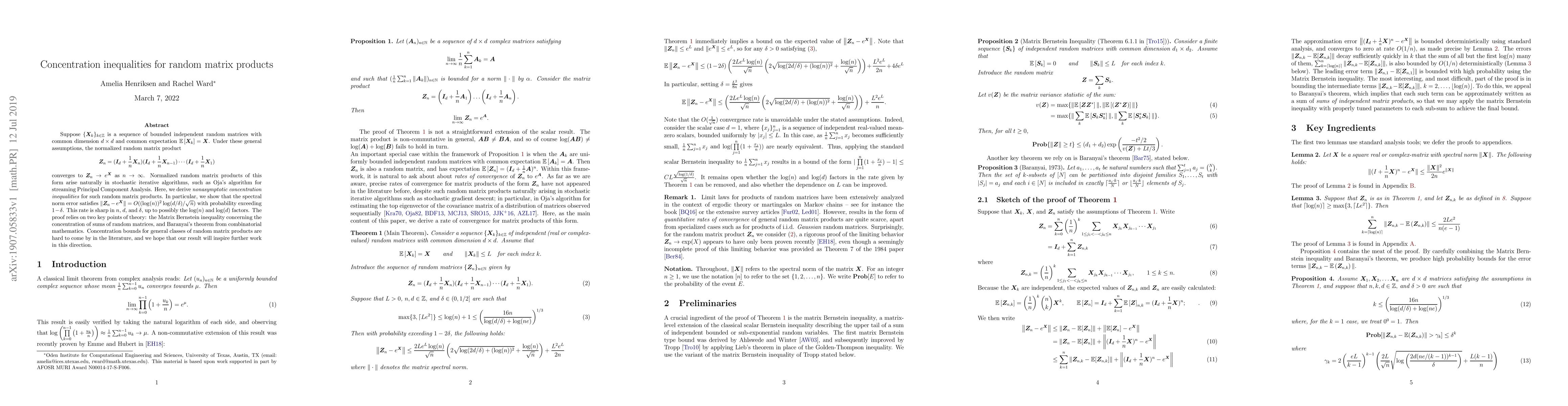 Researchers derive non-asymptotic concentration inequalities for random matrix products, showing that spectral norm error decreases at a rate of O((°log(n))^{2}±(log(d/θ))/√(n)) with probability > 1-θ.