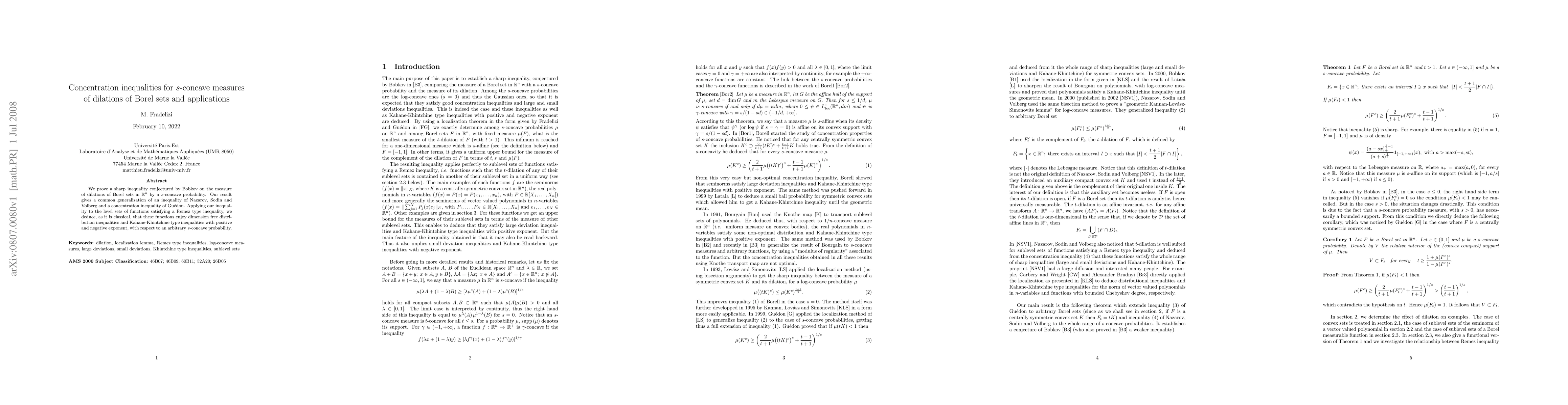 We prove a sharp inequality conjectured by Bobkov on the measure of dilations of Borel sets in $\mathbb{R}^n$ by a $s$-concave probability. Our result gives a common generalization of an inequality of Nazarov, Sodin and Volberg and a concentration inequality of Gu\'edon. Applying our inequality to the level sets of functions satisfying a Remez type inequality, we deduce, as it is classical, that these functions enjoy dimension free distribution inequalities and Kahane-Khintchine type inequalities with positive and negative exponent, with respect to an arbitrary $s$-concave probability.