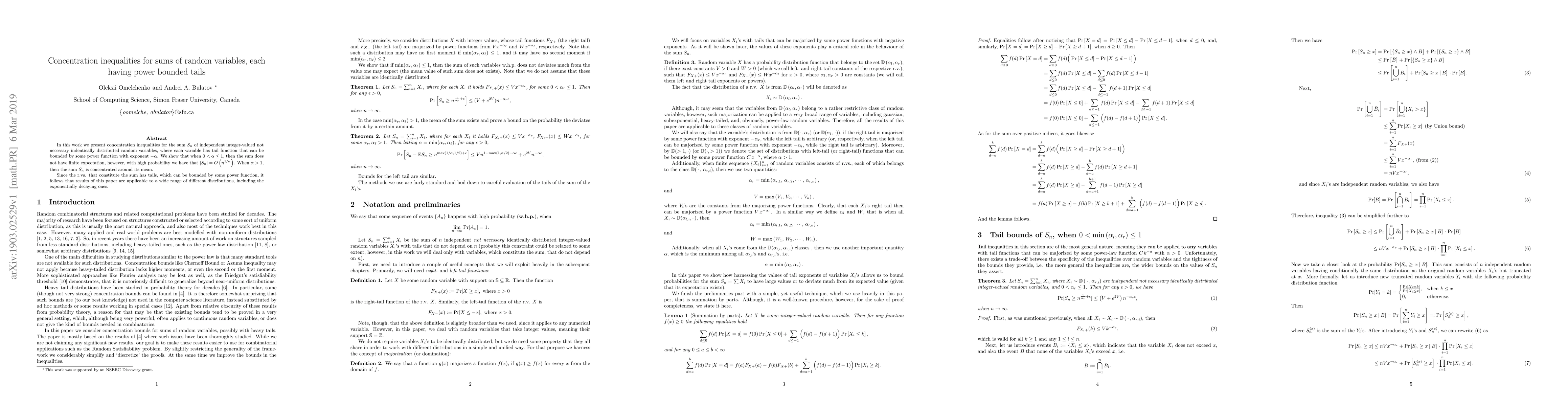 In this work we present concentration inequalities for the sum $S_n$ of independent integer-valued not necessary indentically distributed random variables, where each variable has tail function that can be bounded by some power function with exponent $-\alpha$. We show that when $0<\alpha\leq 1$, then the sum does not have finite expectation, however, with high probability we have that $|S_n|=O\left(n^{1/\alpha}\right)$. When $\alpha>1$, then the sum $S_n$ is concentrated around its mean. Since the r.vs. that constitute the sum has tails, which can be bounded by some power function, it follows that results of this paper are applicable to a wide range of different distributions, including the exponentially decaying ones.