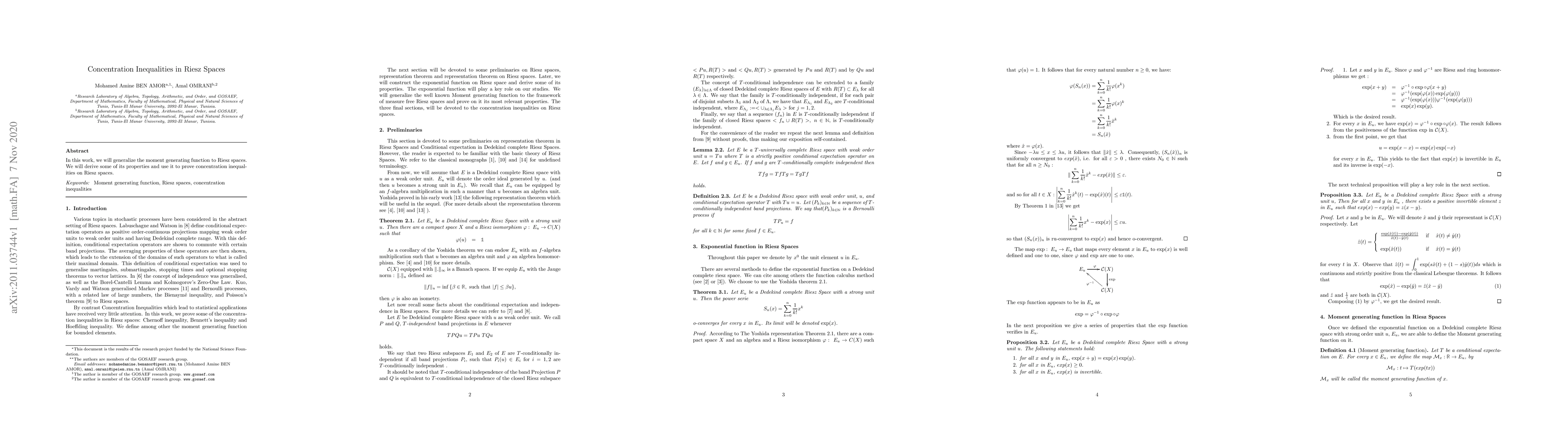 Summary: This paper generalizes the moment generating function to Riesz spaces, deriving its properties and utilizing it to establish concentration inequalities within this mathematical framework.