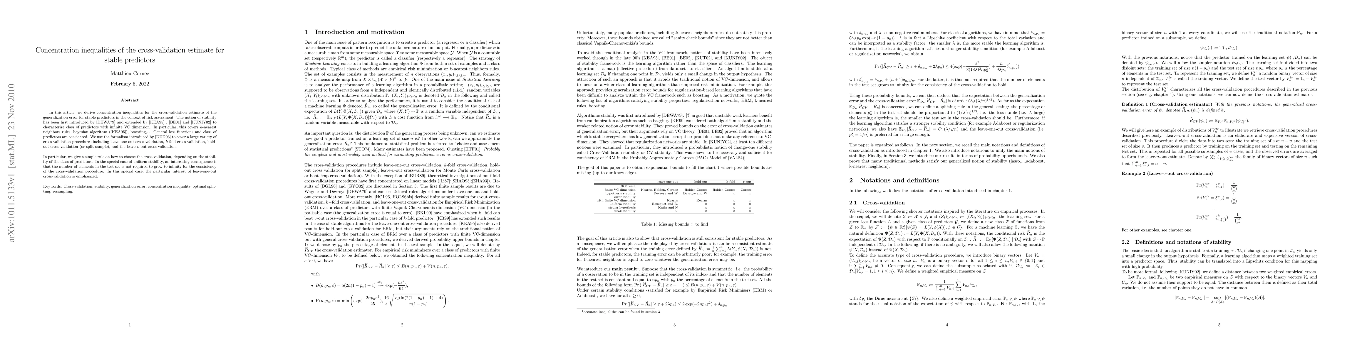 This paper derives concentration inequalities for the cross-validation estimate of generalization error for stable predictors, emphasizing the importance of stability in risk assessment. It highlights that for uniformly stable predictors, the cross-validation consistency does not require the test set size to grow indefinitely, underscoring the utility of leave-one-out cross-validation.