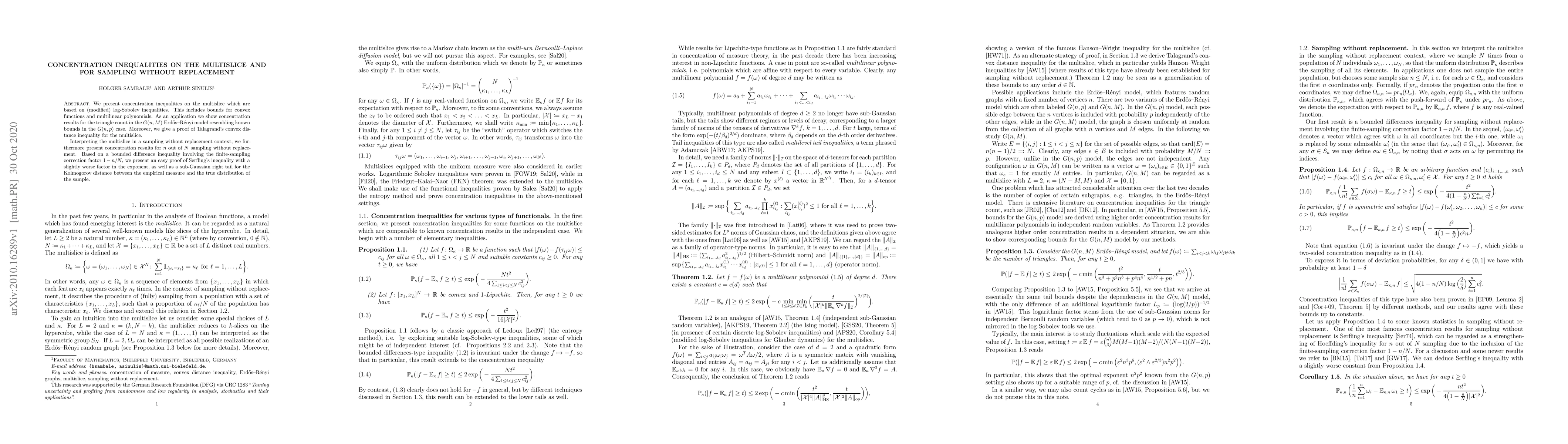 We present concentration inequalities on the multislice which are based on (modified) log-Sobolev inequalities. This includes bounds for convex functions and multilinear polynomials. As an application we show concentration results for the triangle count in the $G(n,M)$ Erd\H{o}s--R\'{e}nyi model resembling known bounds in the $G(n,p)$ case. Moreover, we give a proof of Talagrand's convex distance inequality for the multislice. Interpreting the multislice in a sampling without replacement context, we furthermore present concentration results for $n$ out of $N$ sampling without replacement. Based on a bounded difference inequality involving the finite-sampling correction factor $1- n/N$, we present an easy proof of Serfling's inequality with a slightly worse factor in the exponent, as well as a sub-Gaussian right tail for the Kolmogorov distance between the empirical measure and the true distribution of the sample.