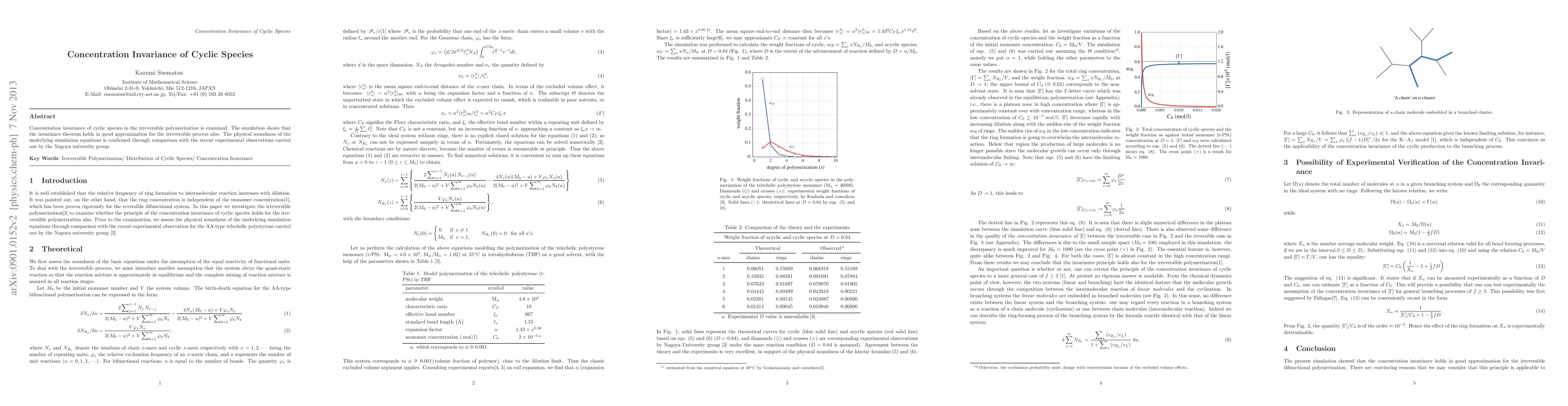 Concentration invariance of cyclic species in the irreversible polymerization is examined. The simulation shows that the invariance theorem holds in good approximation for the irreversible process also. The physical soundness of the underlying simulation equations is confirmed through comparison with the recent experimental observations carried out by the Nagoya university group.