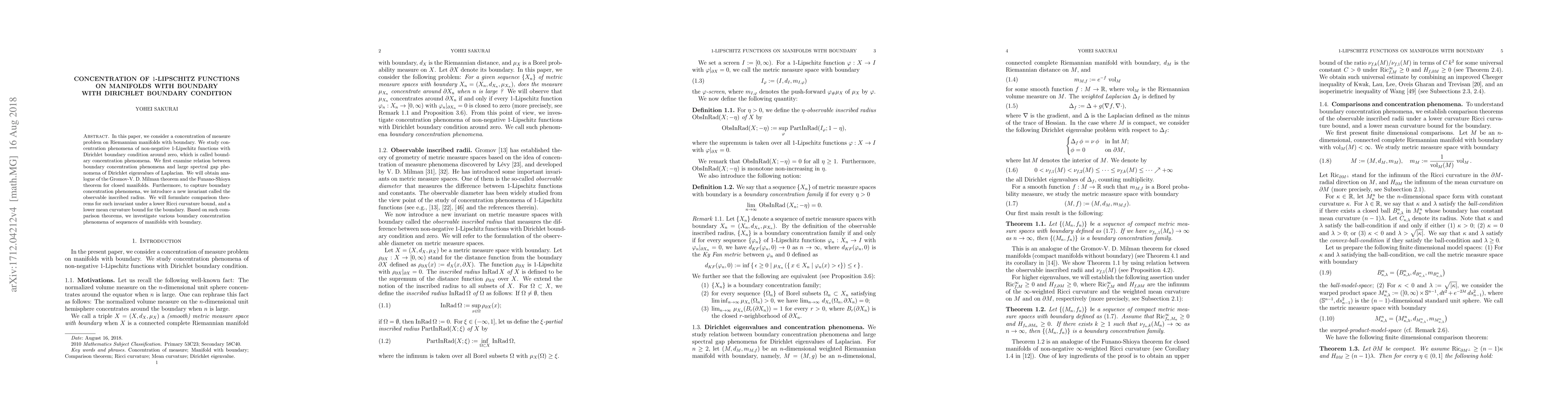 In this paper, we consider a concentration of measure problem on Riemannian manifolds with boundary. We study concentration phenomena of non-negative $1$-Lipschitz functions with Dirichlet boundary condition around zero, which is called boundary concentration phenomena. We first examine relation between boundary concentration phenomena and large spectral gap phenomena of Dirichlet eigenvalues of Laplacian. We will obtain analogue of the Gromov-V. D. Milman theorem and the Funano-Shioya theorem for closed manifolds. Furthermore, to capture boundary concentration phenomena, we introduce a new invariant called the observable inscribed radius. We will formulate comparison theorems for such invariant under a lower Ricci curvature bound, and a lower mean curvature bound for the boundary. Based on such comparison theorems, we investigate various boundary concentration phenomena of sequences of manifolds with boundary.