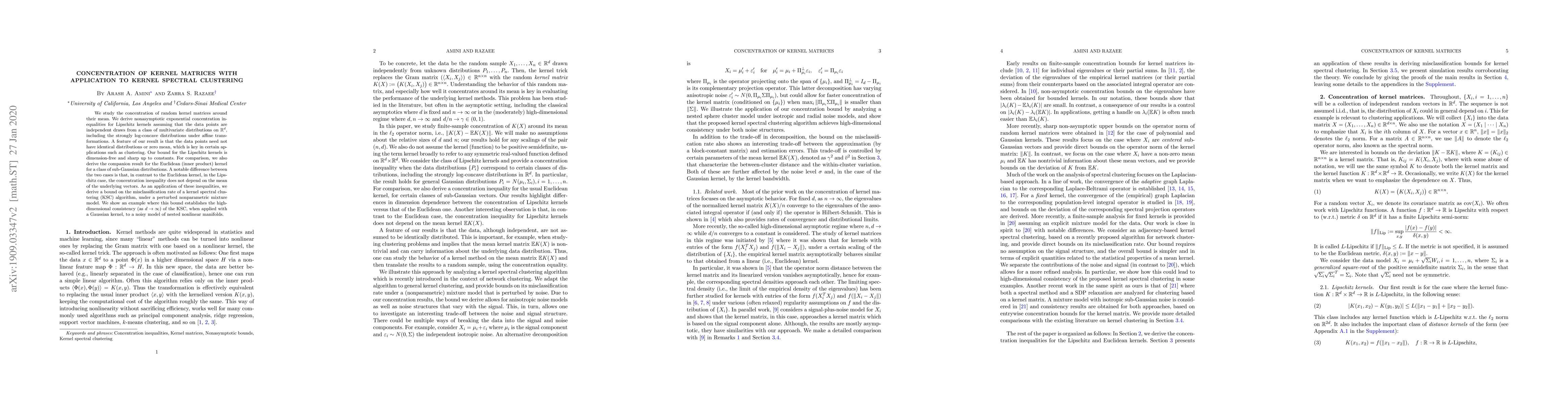 We study the concentration of random kernel matrices around their mean. We derive nonasymptotic exponential concentration inequalities for Lipschitz kernels assuming that the data points are independent draws from a class of multivariate distributions on $\mathbb R^d$, including the strongly log-concave distributions under affine transformations. A feature of our result is that the data points need not have identical distributions or zero mean, which is key in certain applications such as clustering. Our bound for the Lipschitz kernels is dimension-free and sharp up to constants. For comparison, we also derive the companion result for the Euclidean (inner product) kernel for a class of sub-Gaussian distributions. A notable difference between the two cases is that, in contrast to the Euclidean kernel, in the Lipschitz case, the concentration inequality does not depend on the mean of the underlying vectors. As an application of these inequalities, we derive a bound on the misclassification rate of a kernel spectral clustering (KSC) algorithm, under a perturbed nonparametric mixture model. We show an example where this bound establishes the high-dimensional consistency (as $d \to \infty$) of the KSC, when applied with a Gaussian kernel, to a noisy model of nested nonlinear manifolds.