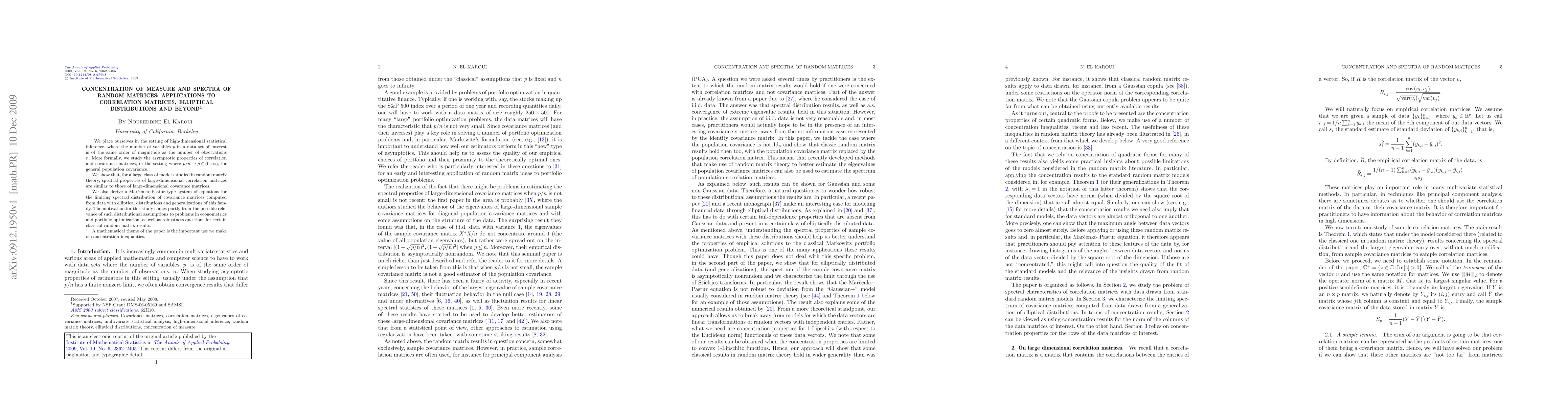 We place ourselves in the setting of high-dimensional statistical inference, where the number of variables $p$ in a data set of interest is of the same order of magnitude as the number of observations $n$. More formally, we study the asymptotic properties of correlation and covariance matrices, in the setting where $p/n\to\rho\in(0,\infty),$ for general population covariance. We show that, for a large class of models studied in random matrix theory, spectral properties of large-dimensional correlation matrices are similar to those of large-dimensional covarance matrices. We also derive a Mar\u{c}enko--Pastur-type system of equations for the limiting spectral distribution of covariance matrices computed from data with elliptical distributions and generalizations of this family. The motivation for this study comes partly from the possible relevance of such distributional assumptions to problems in econometrics and portfolio optimization, as well as robustness questions for certain classical random matrix results. A mathematical theme of the paper is the important use we make of concentration inequalities.