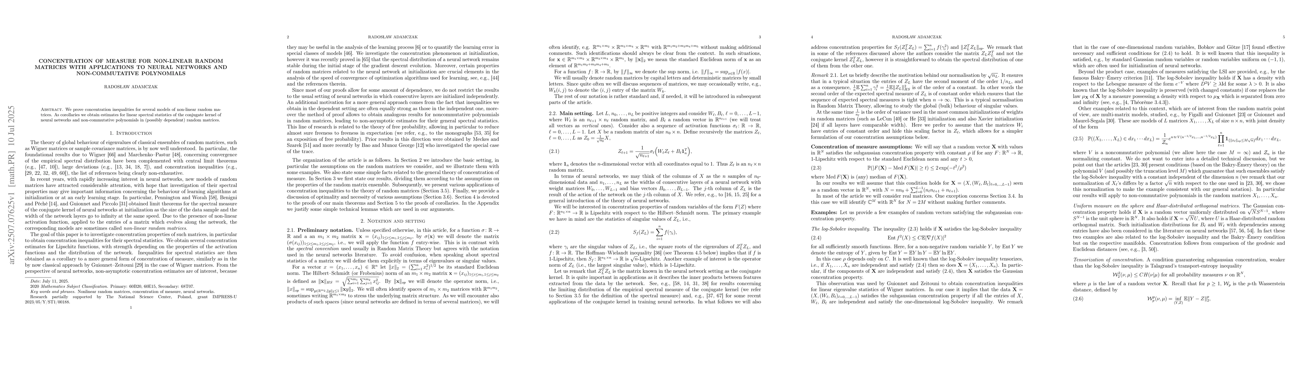 We prove concentration inequalities for several models of non-linear random matrices. As corollaries we obtain estimates for linear spectral statistics of the conjugate kernel of neural networks and non-commutative polynomials in (possibly dependent) random matrices.