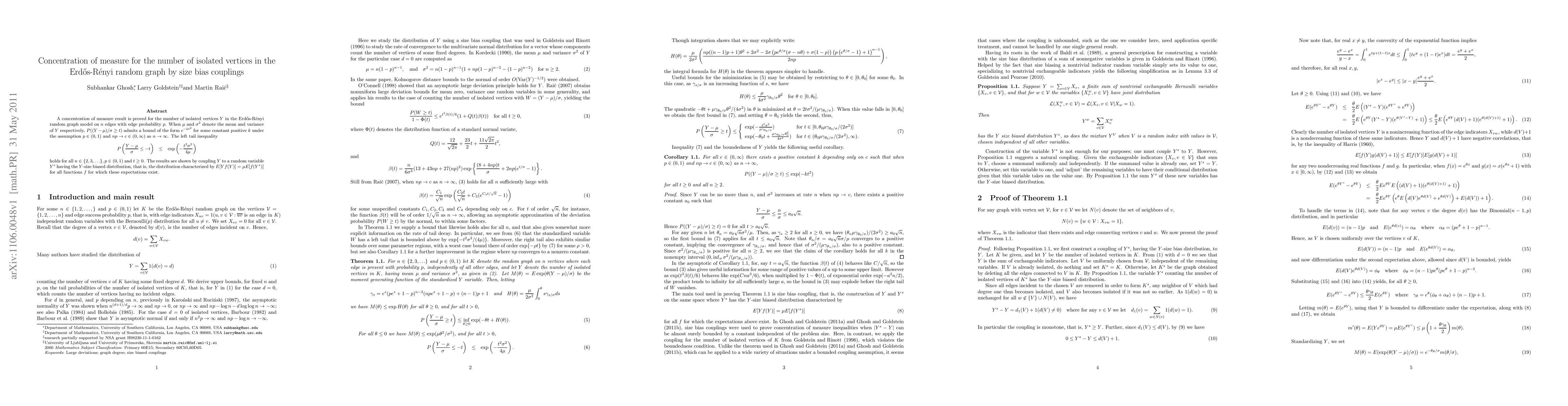 A concentration of measure result is proved for the number of isolated vertices $Y$ in the Erd\H{o}s-R\'{e}nyi random graph model on $n$ edges with edge probability $p$. When $\mu$ and $\sigma^2$ denote the mean and variance of $Y$ respectively, $P((Y-\mu)/\sigma\ge t)$ admits a bound of the form $e^{-kt^2}$ for some constant positive $k$ under the assumption $p \in (0,1)$ and $np\rightarrow c \in (0,\infty)$ as $n \rightarrow \infty$. The left tail inequality $$ P(\frac{Y-\mu}{\sigma}\le -t)&\le& \exp(-\frac{t^2\sigma^2}{4\mu}) $$ holds for all $n \in {2,3,...},p \in (0,1)$ and $t \ge 0$. The results are shown by coupling $Y$ to a random variable $Y^s$ having the $Y$-size biased distribution, that is, the distribution characterized by $E[Yf(Y)]=\mu E[f(Y^s)] $ for all functions $f$ for which these expectations exist.