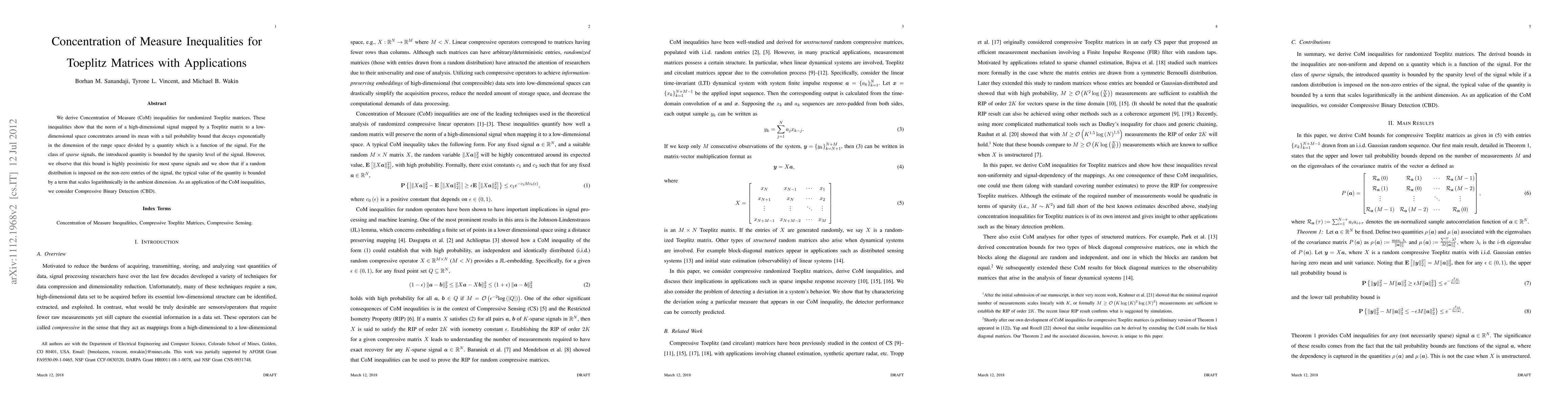 This paper derives Concentration of Measure inequalities for randomized Toeplitz matrices, showing that signals mapped to a low-dimensional space concentrate around their mean with exponential tail probability bounds. The findings have implications for Compressive Binary Detection.