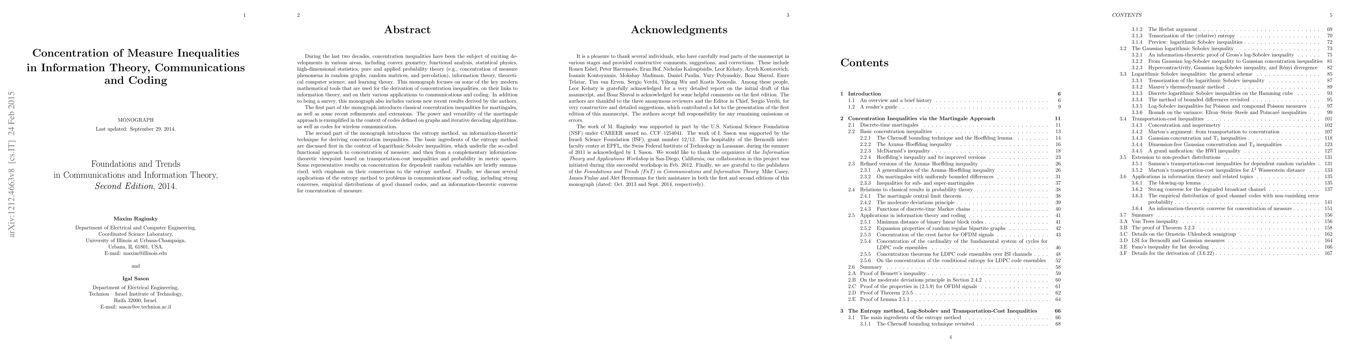 During the last two decades, concentration inequalities have been the subject of exciting developments in various areas, including convex geometry, functional analysis, statistical physics, high-dimensional statistics, pure and applied probability theory, information theory, theoretical computer science, and learning theory. This monograph focuses on some of the key modern mathematical tools that are used for the derivation of concentration inequalities, on their links to information theory, and on their various applications to communications and coding. In addition to being a survey, this monograph also includes various new recent results derived by the authors. The first part of the monograph introduces classical concentration inequalities for martingales, as well as some recent refinements and extensions. The power and versatility of the martingale approach is exemplified in the context of codes defined on graphs and iterative decoding algorithms, as well as codes for wireless communication. The second part of the monograph introduces the entropy method, an information-theoretic technique for deriving concentration inequalities. The basic ingredients of the entropy method are discussed first in the context of logarithmic Sobolev inequalities, which underlie the so-called functional approach to concentration of measure, and then from a complementary information-theoretic viewpoint based on transportation-cost inequalities and probability in metric spaces. Some representative results on concentration for dependent random variables are briefly summarized, with emphasis on their connections to the entropy method. Finally, we discuss several applications of the entropy method to problems in communications and coding, including strong converses, empirical distributions of good channel codes, and an information-theoretic converse for concentration of measure.