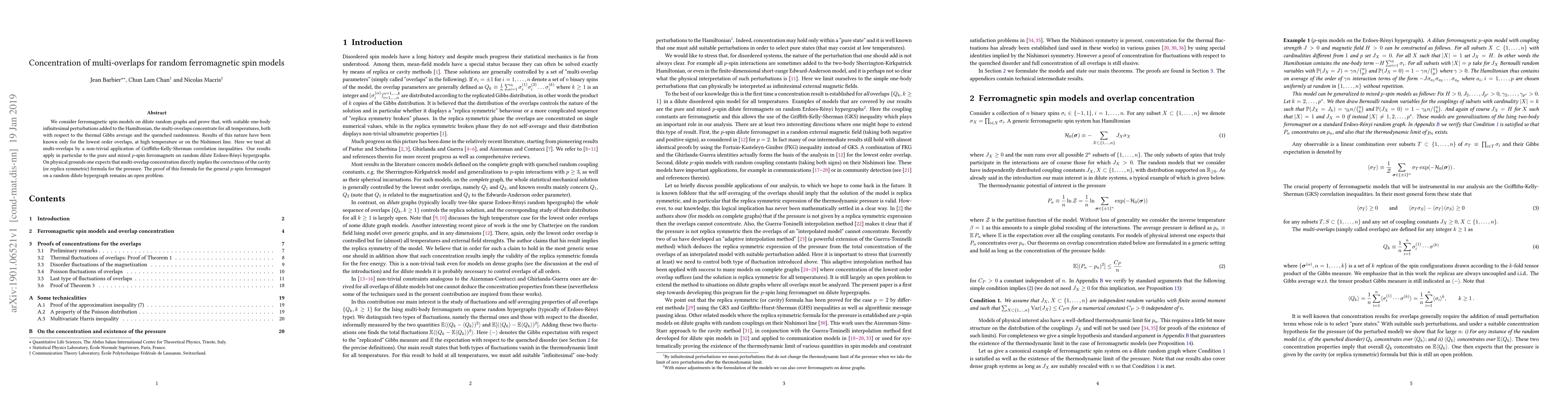 This paper proves that multi-overlaps in random ferromagnetic spin models on dilute random graphs concentrate under suitable perturbations, extending known results to all orders and temperatures. The findings support the cavity formula for pressure but leave its general proof for p-spin ferromagnets on random hypergraphs unresolved.