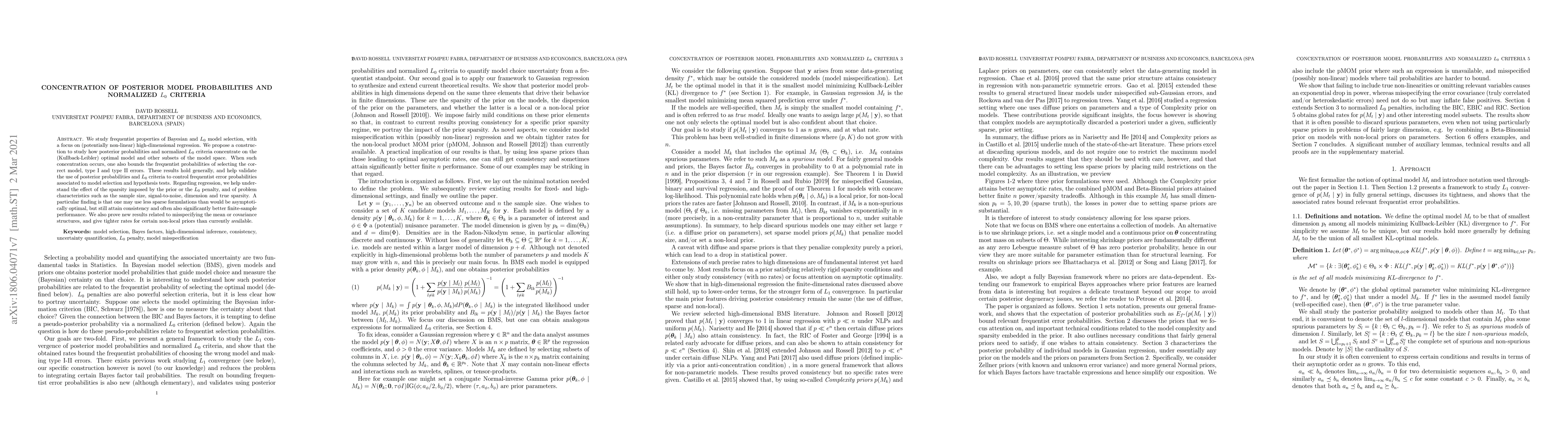 We study frequentist properties of Bayesian and $L_0$ model selection, with a focus on (potentially non-linear) high-dimensional regression. We propose a construction to study how posterior probabilities and normalized $L_0$ criteria concentrate on the (Kullback-Leibler) optimal model and other subsets of the model space. When such concentration occurs, one also bounds the frequentist probabilities of selecting the correct model, type I and type II errors. These results hold generally, and help validate the use of posterior probabilities and $L_0$ criteria to control frequentist error probabilities associated to model selection and hypothesis tests. Regarding regression, we help understand the effect of the sparsity imposed by the prior or the $L_0$ penalty, and of problem characteristics such as the sample size, signal-to-noise, dimension and true sparsity. A particular finding is that one may use less sparse formulations than would be asymptotically optimal, but still attain consistency and often also significantly better finite-sample performance. We also prove new results related to misspecifying the mean or covariance structures, and give tighter rates for certain non-local priors than currently available.