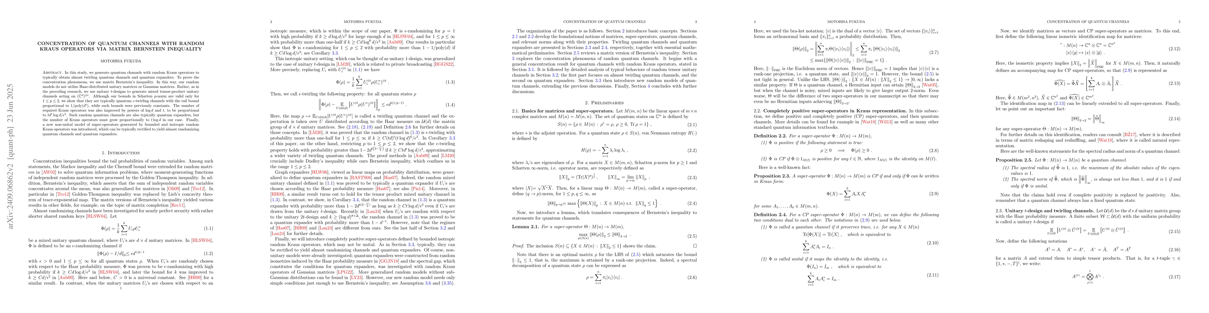 In this study, we generate quantum channels with random Kraus operators to typically obtain almost twirling quantum channels and quantum expanders. To prove the concentration phenomena, we use matrix Bernstein's inequality. In this way, our random models do not utilize Haar-distributed unitary matrices or Gaussian matrices. Rather, as in the preceding research, we use unitary $t$-designs to generate mixed tenor-product unitary channels acting on $(\mathbb C^{d})^{\otimes t}$. Although our bounds in Schatten $p$-norm are valid only for $1\leq p \leq 2$, we show that they are typically almost twirling quantum channels with the tail bound proportional to $1/\mathrm{poly}(d^t)$, while such bounds were previously constants. The number of required Kraus operators was also improved by powers of $\log d$ and $t$. Such random quantum channels are also typically quantum expanders, but the number of Kraus operators must grow proportionally to $\log d$ in our case. Finally, a new non-unital model of super-operators generated by bounded and isotropic random Kraus operators was introduced, which can be typically rectified to give almost randomizing quantum channels and quantum expanders.