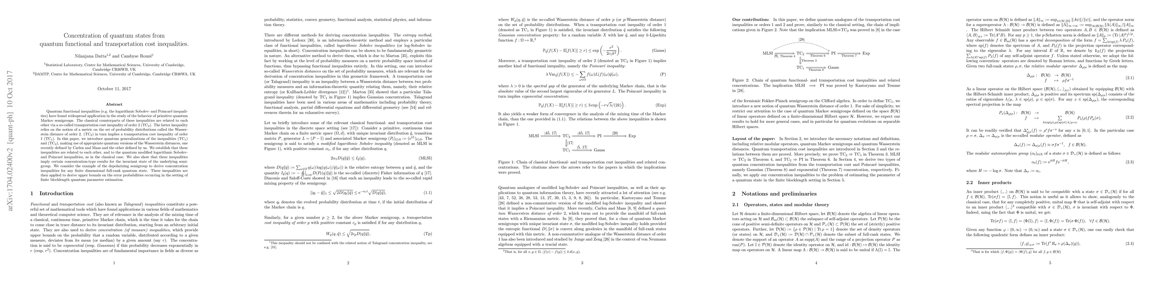 Quantum functional inequalities (e.g. the logarithmic Sobolev- and Poincar\'e inequalities) have found widespread application in the study of the behavior of primitive quantum Markov semigroups. The classical counterparts of these inequalities are related to each other via a so-called transportation cost inequality of order 2 (TC2). The latter inequality relies on the notion of a metric on the set of probability distributions called the Wasserstein distance of order 2. (TC2) in turn implies a transportation cost inequality of order 1 (TC1). In this paper, we introduce quantum generalizations of the inequalities (TC1) and (TC2), making use of appropriate quantum versions of the Wasserstein distances, one recently defined by Carlen and Maas and the other defined by us. We establish that these inequalities are related to each other, and to the quantum modified logarithmic Sobolev- and Poincar\'e inequalities, as in the classical case. We also show that these inequalities imply certain concentration-type results for the invariant state of the underlying semigroup. We consider the example of the depolarizing semigroup to derive concentration inequalities for any finite dimensional full-rank quantum state. These inequalities are then applied to derive upper bounds on the error probabilities occurring in the setting of finite blocklength quantum parameter estimation.