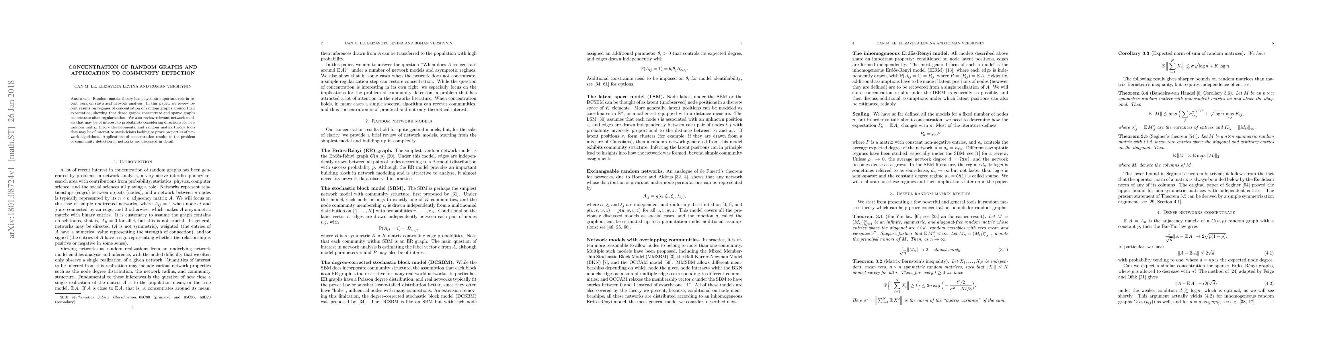 This paper reviews recent work on concentration of random graphs, showing that dense graphs concentrate and sparse graphs concentrate after regularization, with applications to community detection in networks.