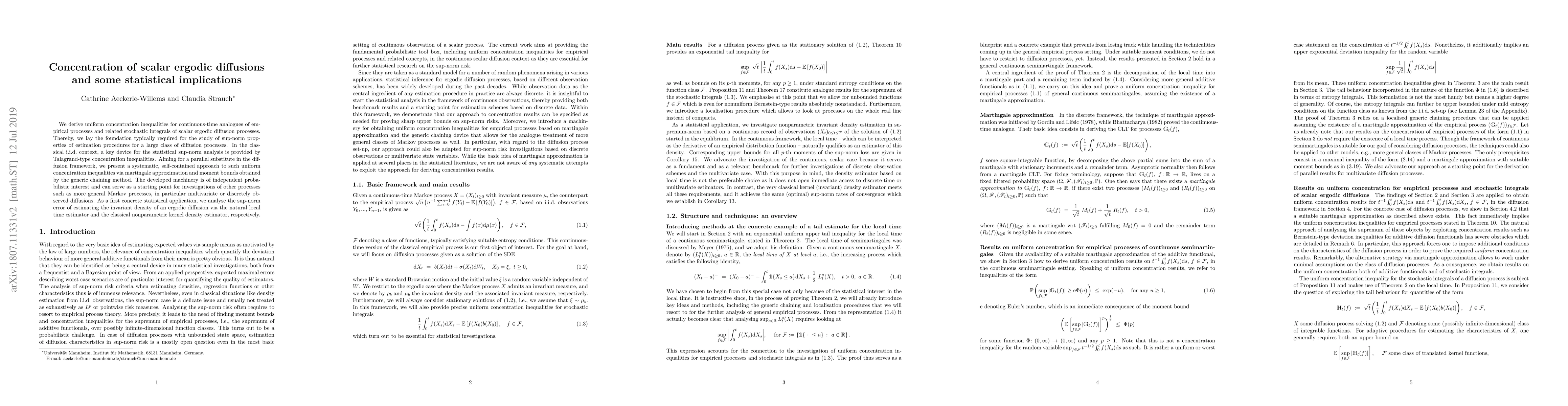 This paper derives uniform concentration inequalities for scalar ergodic diffusion processes, establishing foundational results for statistical analysis of estimation procedures. It introduces a systematic approach using martingale approximation and the generic chaining method, with applications to estimating the invariant density of ergodic diffusions.