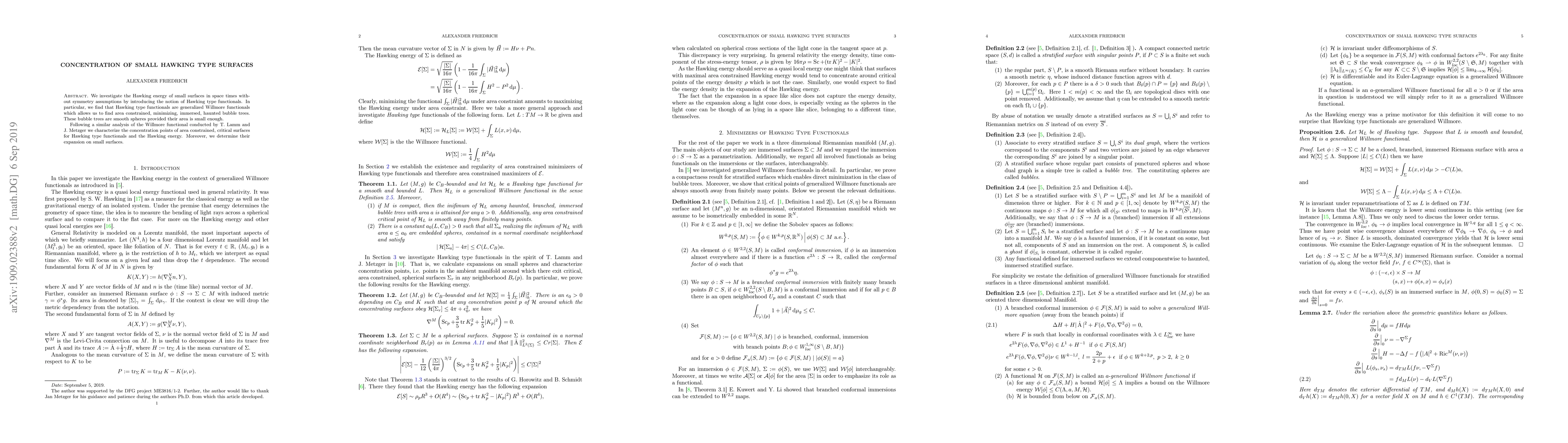 We investigate the Hawking energy of small surfaces in space times without symmetry assumptions by introducing the notion of Hawking type functionals. In particular, we find that Hawking type functionals are generalized Willmore functionals which allows us to find area constrained, minimizing, immersed, haunted bubble trees. These bubble trees are smooth spheres provided their area is small enough. Following a similar analysis of the Willmore functional conducted by T. Lamm and J. Metzger we characterize the concentration points of area constrained, critical surfaces for Hawking type functionals and the Hawking energy. Moreover, we determine their expansion on small surfaces.