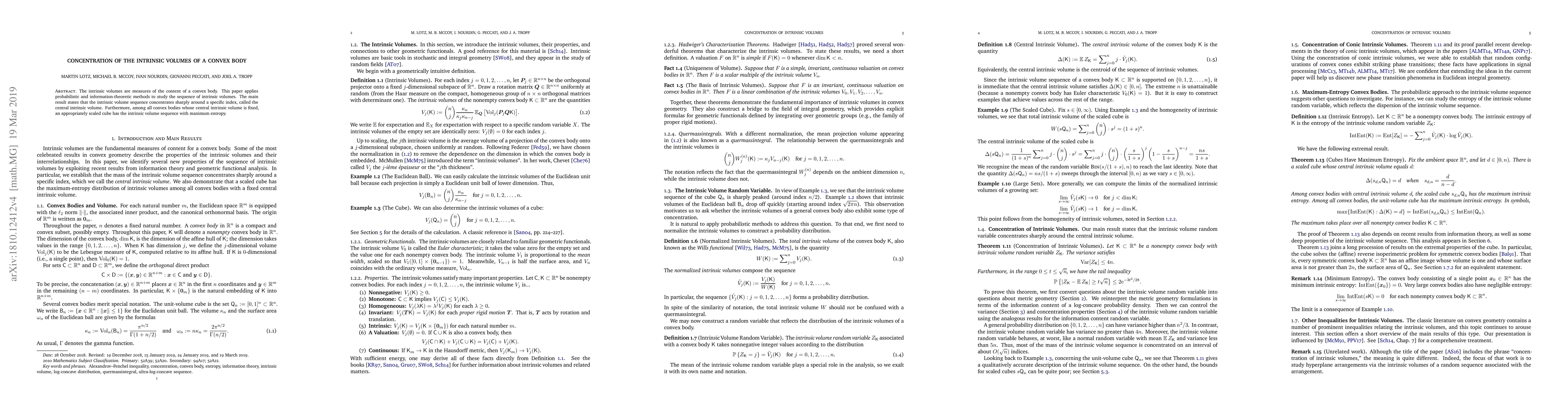 The intrinsic volumes are measures of the content of a convex body. This paper uses probabilistic and information-theoretic methods to study the sequence of intrinsic volumes of a convex body. The main result states that the intrinsic volume sequence concentrates sharply around a specific index, called the central intrinsic volume. Furthermore, among all convex bodies whose central intrinsic volume is fixed, an appropriately scaled cube has the intrinsic volume sequence with maximum entropy.