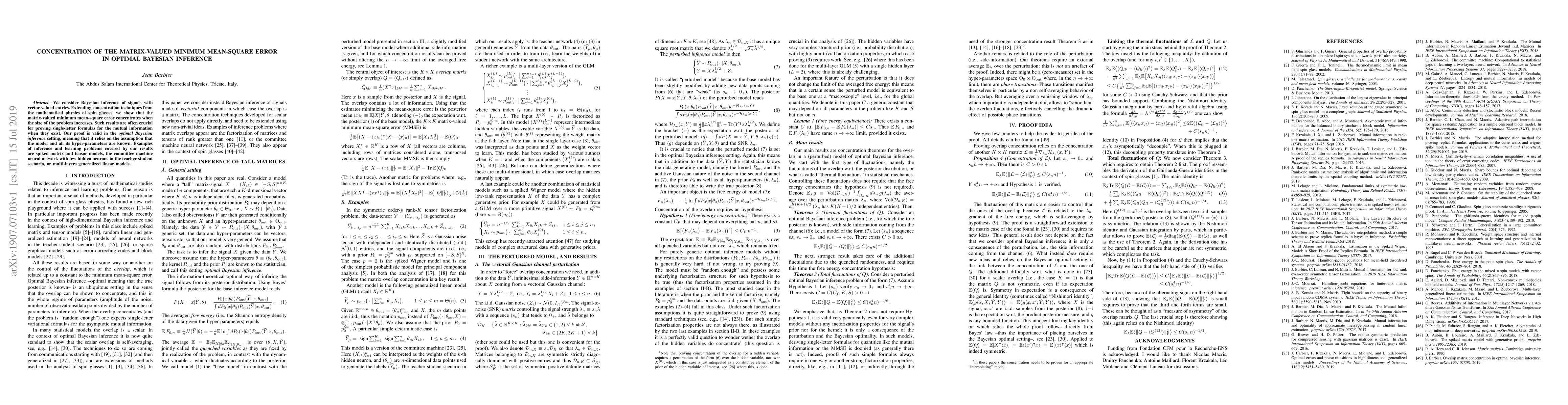 This paper demonstrates that the matrix-valued minimum mean-square error in Bayesian inference concentrates as problem size increases, using techniques from spin glasses. This concentration is crucial for proving mutual information formulas in optimal Bayesian settings, applicable to models like spiked matrices and neural networks.