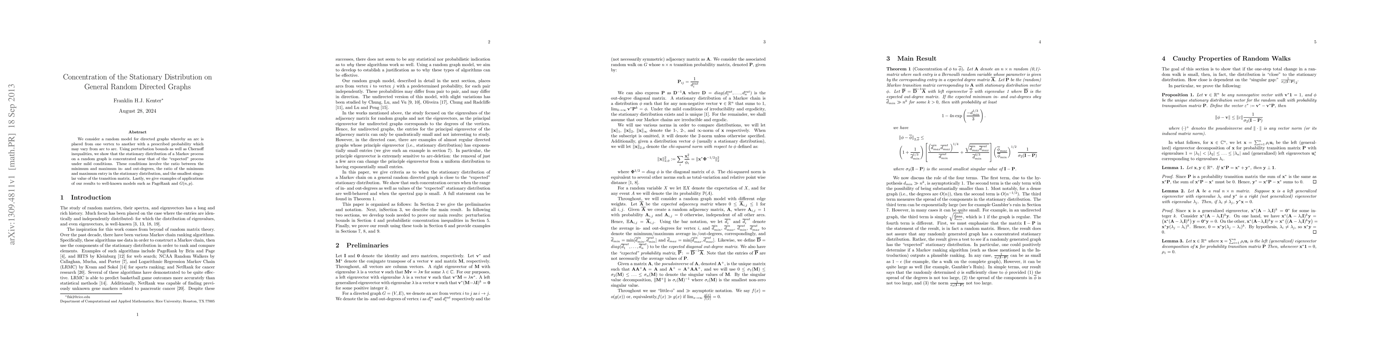This paper investigates the concentration of the stationary distribution in Markov processes on general random directed graphs, demonstrating that it closely aligns with the expected distribution under mild conditions. The study applies perturbation bounds and Chernoff inequalities to derive these results, and it also provides examples of applications to models like PageRank.