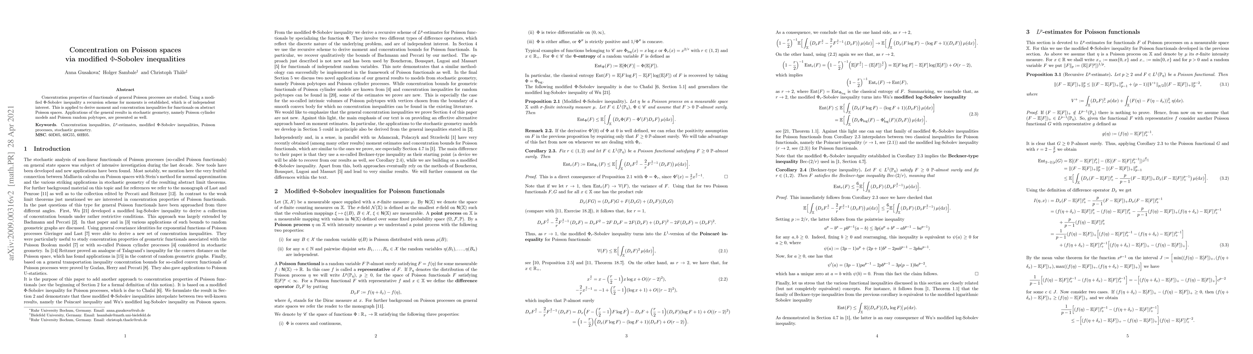 This paper investigates concentration properties of functionals on Poisson processes through modified $\Phi$-Sobolev inequalities, establishing a recursion scheme for moments and deriving moment and concentration inequalities for abstract Poisson spaces. Applications include stochastic geometry, specifically Poisson cylinder models and random polytopes.