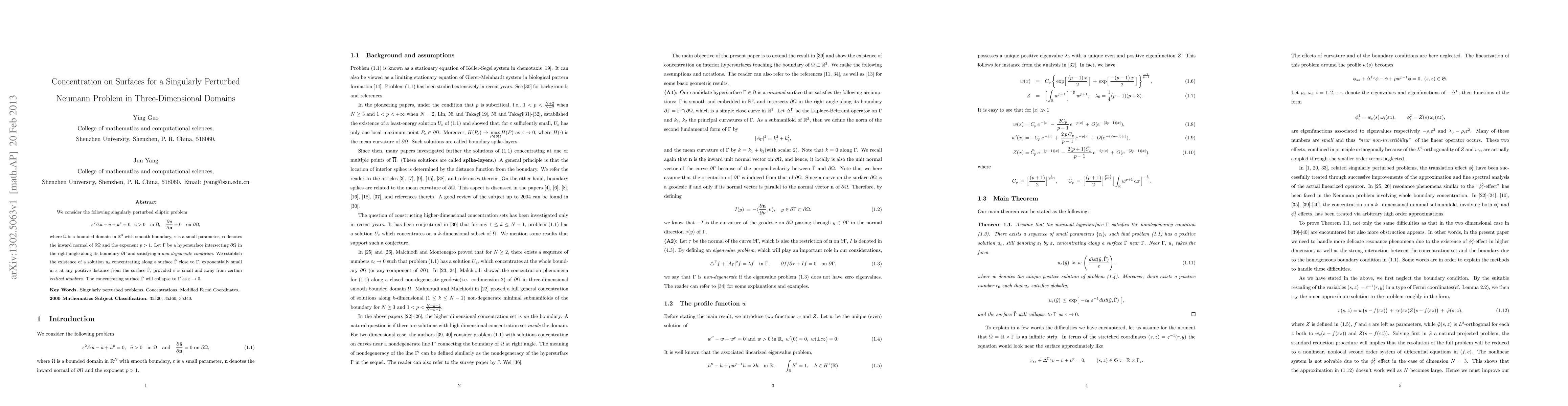 We consider the following singularly perturbed elliptic problem $$ \varepsilon^2\triangle\tilde{u}-\tilde{u}+\tilde{u}^p=0, \ \tilde{u}>0\quad \mbox{in} \ \Omega,\ \ \ \frac{\partial\tilde{u}}{\partial \mathbf{n}}=0 \quad \mbox{on}\ \partial\Omega, $$ where $\Omega$ is a bounded domain in $\mathbb{R}^3$ with smooth boundary, $\varepsilon$ is a small parameter, $\mathbf{n}$ denotes the inward normal of $ \partial\Omega$ and the exponent $p>1$. Let $\Gamma$ be a hypersurface intersecting $\partial\Omega$ in the right angle along its boundary $\partial\Gamma$ and satisfying a {\em non-degenerate condition}. We establish the existence of a solution $u_\varepsilon$ concentrating along a surface $\tilde{\Gamma}$ close to $\Gamma$, exponentially small in $\varepsilon$ at any positive distance from the surface $\tilde{\Gamma}$, provided $\varepsilon$ is small and away from certain {\em critical numbers}. The concentrating surface $\tilde{\Gamma}$ will collapse to $\Gamma$ as $\varepsilon\rightarrow 0$.
