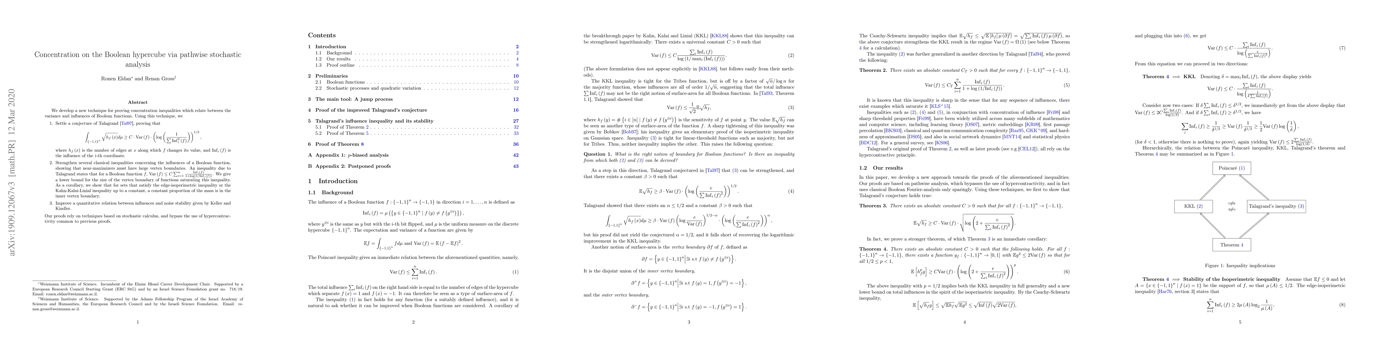 We develop a new technique for proving concentration inequalities which relate between the variance and influences of Boolean functions. Using this technique, we 1. Settle a conjecture of Talagrand [Tal97] proving that $$\int_{\left\{ -1,1\right\} ^{n}}\sqrt{h_{f}\left(x\right)}d\mu\geq C\cdot\mathrm{var}\left(f\right)\cdot\left(\log\left(\frac{1}{\sum\mathrm{Inf}_{i}^{2}\left(f\right)}\right)\right)^{1/2},$$ where $h_{f}\left(x\right)$ is the number of edges at $x$ along which $f$ changes its value, and $\mathrm{Inf}_{i}\left(f\right)$ is the influence of the $i$-th coordinate. 2. Strengthen several classical inequalities concerning the influences of a Boolean function, showing that near-maximizers must have large vertex boundaries. An inequality due to Talagrand states that for a Boolean function $f$, $\mathrm{var}\left(f\right)\leq C\sum_{i=1}^{n}\frac{\mathrm{Inf}_{i}\left(f\right)}{1+\log\left(1/\mathrm{Inf}_{i}\left(f\right)\right)}$. We give a lower bound for the size of the vertex boundary of functions saturating this inequality. As a corollary, we show that for sets that satisfy the edge-isoperimetric inequality or the Kahn-Kalai-Linial inequality up to a constant, a constant proportion of the mass is in the inner vertex boundary. 3. Improve a quantitative relation between influences and noise stability given by Keller and Kindler. Our proofs rely on techniques based on stochastic calculus, and bypass the use of hypercontractivity common to previous proofs.