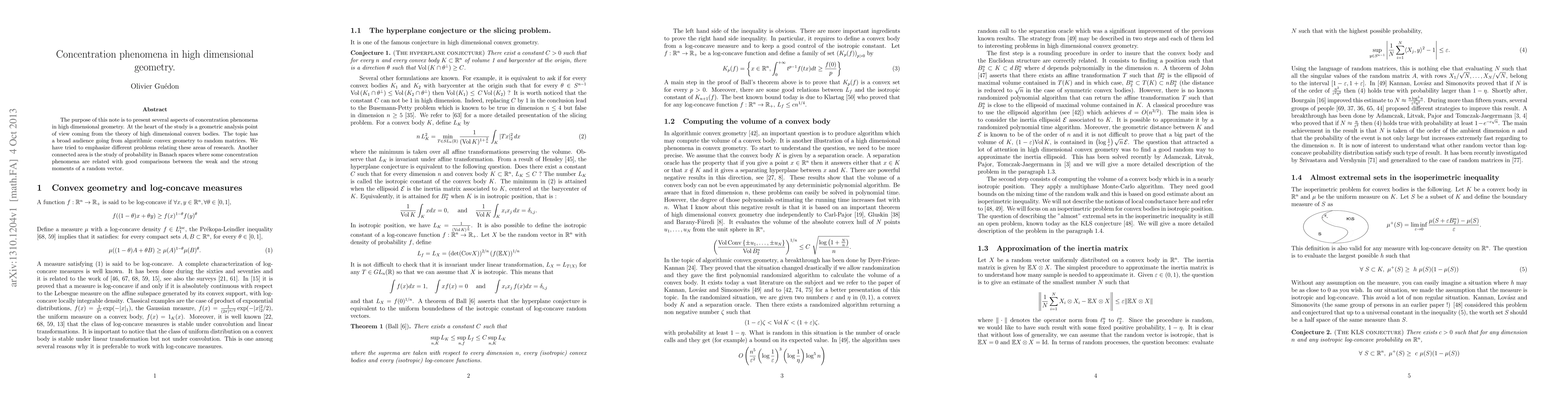 Summary: This paper explores concentration phenomena in high dimensional geometry from a geometric analysis perspective, particularly focusing on convex bodies. It connects algorithmic convex geometry, random matrices, and probability in Banach spaces, emphasizing the relationships between these research areas and their implications for understanding weak and strong moments of random vectors.