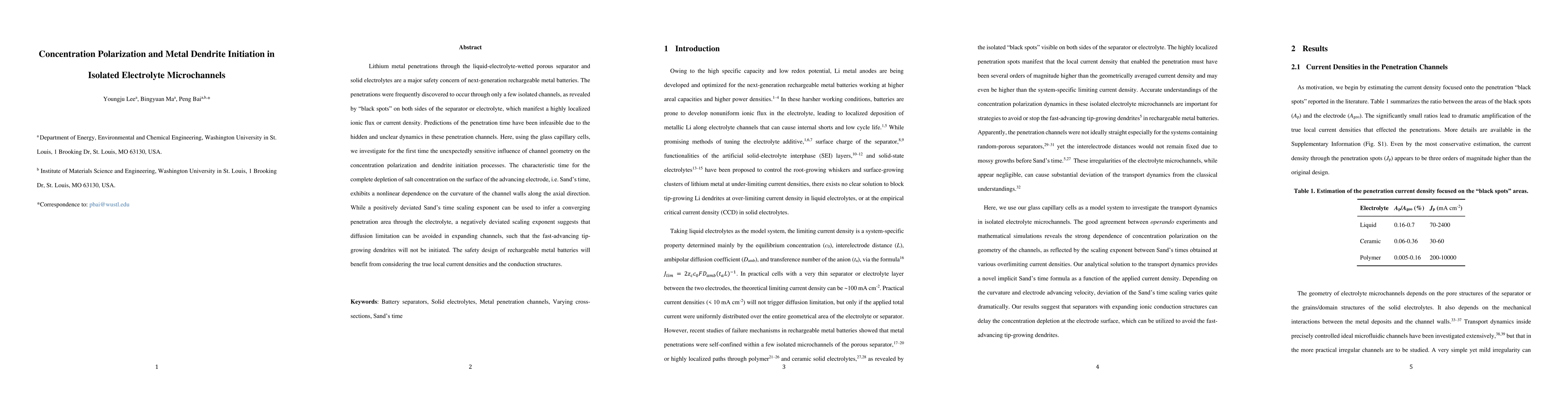 Lithium metal penetrations through the liquid-electrolyte-wetted porous separator and solid electrolytes are a major safety concern of next-generation rechargeable metal batteries. The penetrations were frequently discovered to occur through only a few isolated channels, as revealed by "black spots" on both sides of the separator or electrolyte, which manifest a highly localized ionic flux or current density. Predictions of the penetration time have been infeasible due to the hidden and unclear dynamics in these penetration channels. Here, using the glass capillary cells, we investigate for the first time the unexpectedly sensitive influence of channel geometry on the concentration polarization and dendrite initiation processes. The characteristic time for the complete depletion of salt concentration on the surface of the advancing electrode, i.e. Sand's time, exhibits a nonlinear dependence on the curvature of the channel walls along the axial direction. While a positively deviated Sand's time scaling exponent can be used to infer a converging penetration area through the electrolyte, a negatively deviated scaling exponent suggests that diffusion limitation can be avoided in expanding channels, such that the fast-advancing tip-growing dendrites will not be initiated. The safety design of rechargeable metal batteries will benefit from considering the true local current densities and the conduction structures.