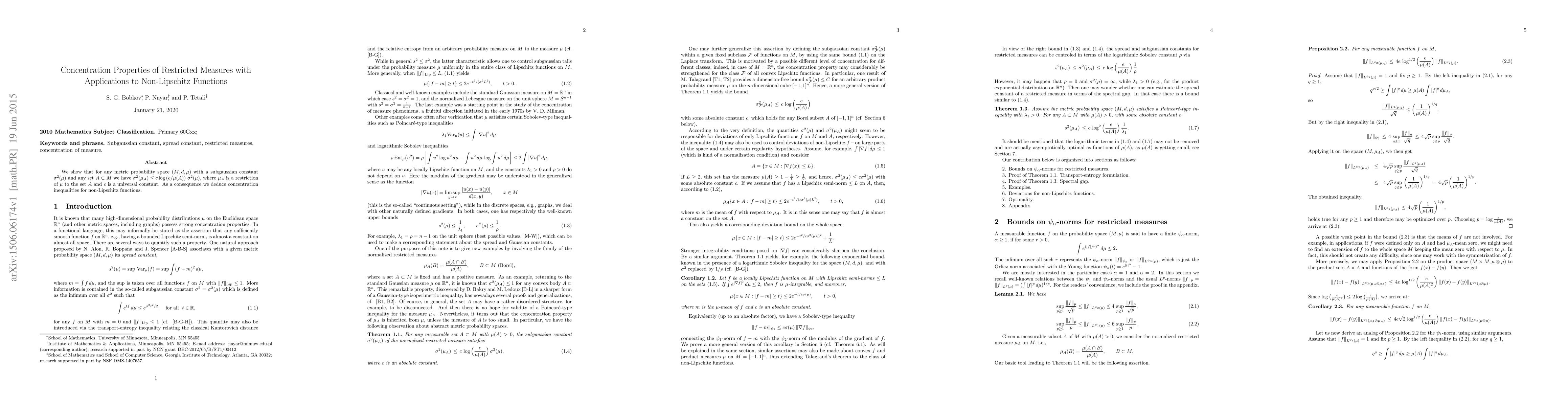This paper establishes a concentration inequality for restricted measures in metric probability spaces, showing that the subgaussian constant scales with a logarithmic factor dependent on the measure of the subset. This result is applied to derive concentration inequalities for non-Lipschitz functions.