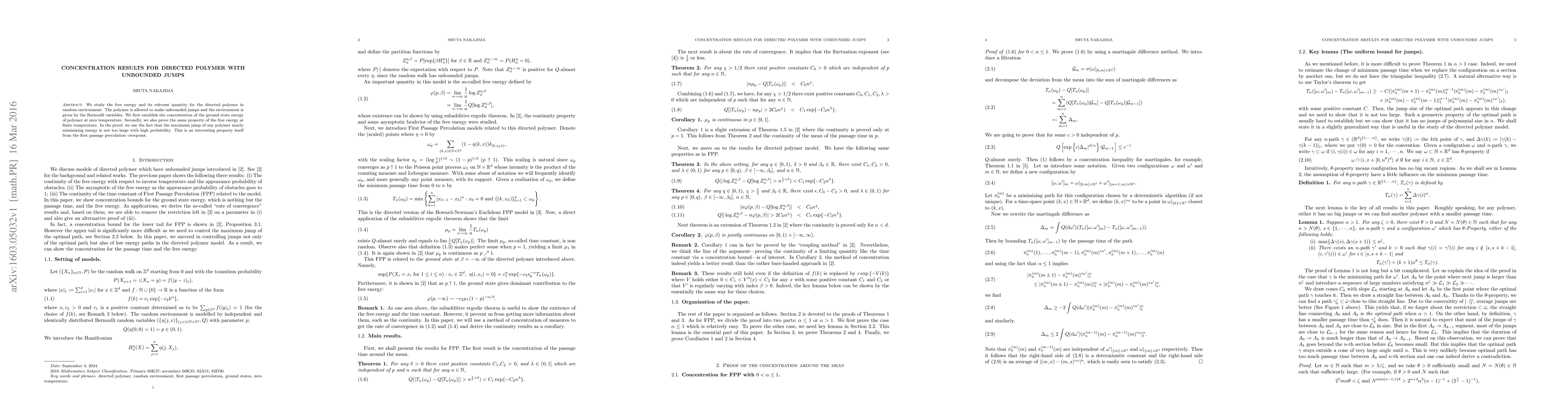 We study the free energy and its relevant quantity for the directed polymer in random environment. The polymer is allowed to make unbounded jumps and the environment is given by the Bernoulli variables. We first establish the concentration of the ground state energy of polymer at zero temperature. Secondly, we also prove the same property of the free energy at finite temperature. In the proof, we use the fact that the maximum jump of any polymer nearly minimizing energy is not too large with high probability. This is an interesting property itself from the first passage percolation viewpoint.
