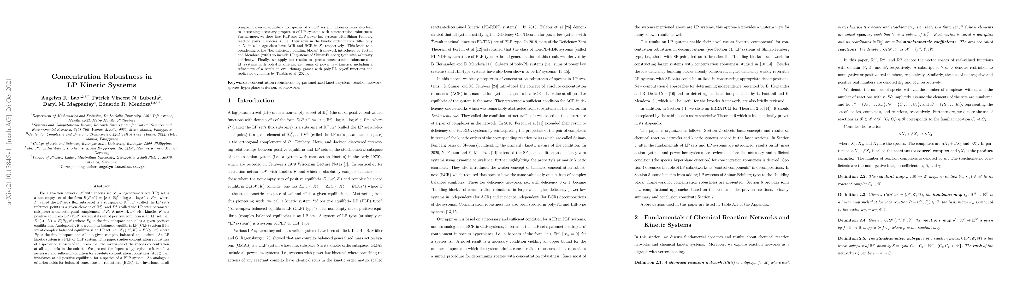 For a reaction network with species set $\mathscr{S}$, a log-parametrized (LP) set is a non-empty set of the form $E(P, x^*) = \{x \in \mathbb{R}^\mathscr{S}_> \mid \log x - \log x^* \in P^\perp\}$ where $P$ (called the LP set's flux subspace) is a subspace of $\mathbb{R}^\mathscr{S}$, $x^*$ (called the LP set's reference point) is a given element of $\mathbb{R}^\mathscr{S}_>$, and $P^\perp$ (called the LP set's parameter subspace) is the orthogonal complement of $P$. A network with kinetics $K$ is a positive equilibria LP (PLP) system if its set of positive equilibria is an LP set. Analogously, it is a complex balanced equilibria LP (CLP) system if its set of complex balanced equilibria is an LP set. An LP kinetic system is a PLP or CLP system. This paper studies concentration robustness of a species on subsets of equilibria. We present the "species hyperplane criterion", a necessary and sufficient condition for absolute concentration robustness (ACR) for a species of a PLP system. An analogous criterion holds for balanced concentration robustness (BCR) for species of a CLP system. These criteria also lead to interesting necessary properties of LP systems with concentration robustness. Furthermore, we show that PLP and CLP power law systems with Shinar-Feinberg reaction pairs in species $X$ in a linkage class have ACR and BCR in $X$, respectively. This leads to a broadening of the "low deficiency building blocks" framework to include LP systems of Shinar-Feinberg type with arbitrary deficiency. Finally, we apply our results to species concentration robustness in LP systems with poly-PL kinetics.