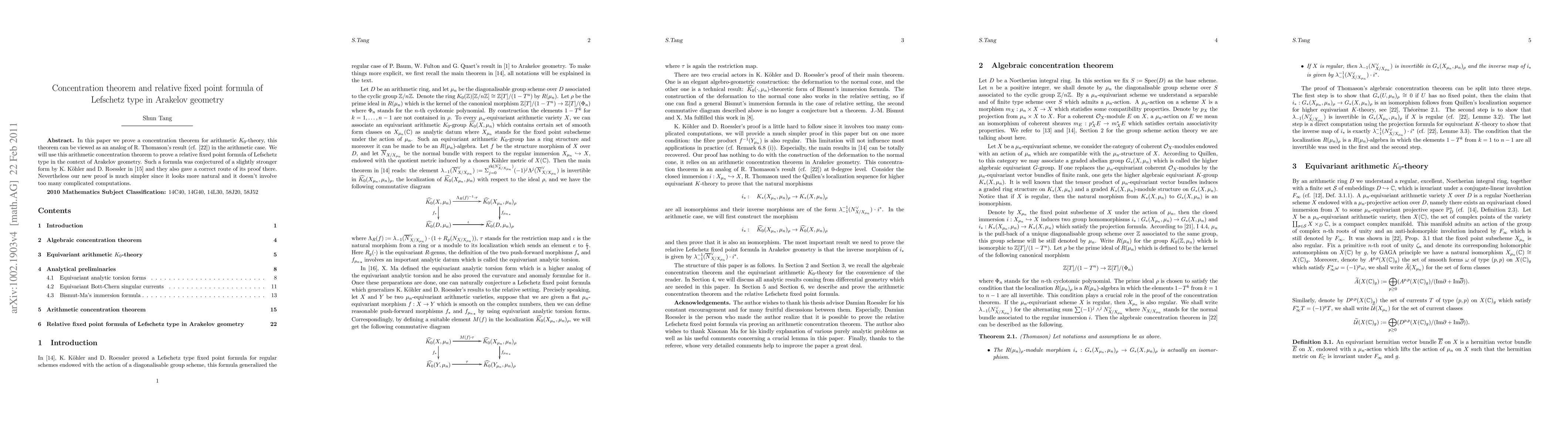 This paper proves a concentration theorem for arithmetic $K_0$-theory in Arakelov geometry, analogous to R. Thomason's result. It then uses this theorem to establish a simpler relative fixed point formula of Lefschetz type in Arakelov geometry, providing a more straightforward proof compared to previous conjectures.