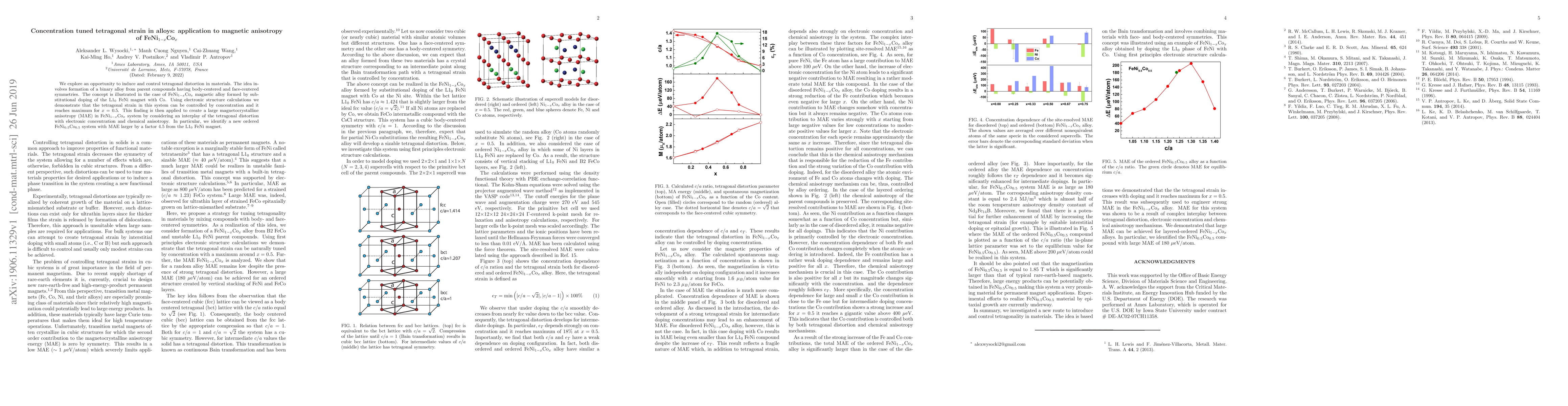 We explore an opportunity to induce and control tetragonal distortion in materials. The idea involves formation of a binary alloy from parent compounds having body-centered and face-centered symmetries. The concept is illustrated in the case of FeNi$_{1-x}$Co$_x$ magnetic alloy formed by substitutional doping of the L1$_0$ FeNi magnet with Co. Using electronic structure calculations we demonstrate that the tetragonal strain in this system can be controlled by concentration and it reaches maximum for $x=0.5$. This finding is then applied to create a large magnetocrystalline anisotropy (MAE) in FeNi$_{1-x}$Co$_x$ system by considering an interplay of the tetragonal distortion with electronic concentration and chemical anisotropy. In particular, we identify a new ordered FeNi$_{0.5}$Co$_{0.5}$ system with MAE larger by a factor 4.5 from the L1$_0$ FeNi magnet.