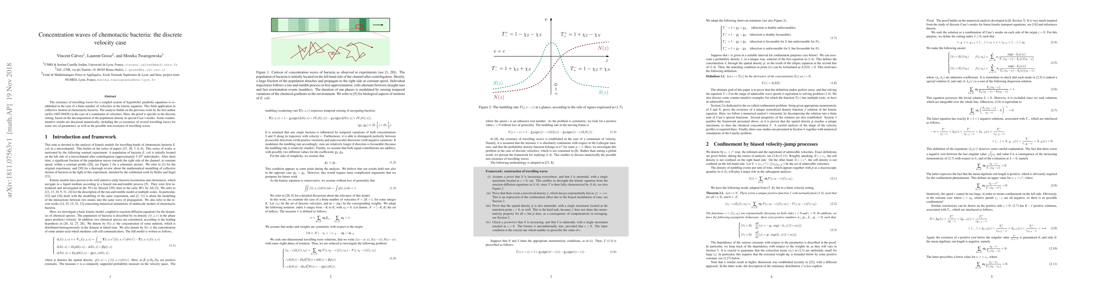 This work is significant for understanding collective motion of chemotactic bacteria, providing a discrete velocity case analysis which complements previous continuous velocity studies.