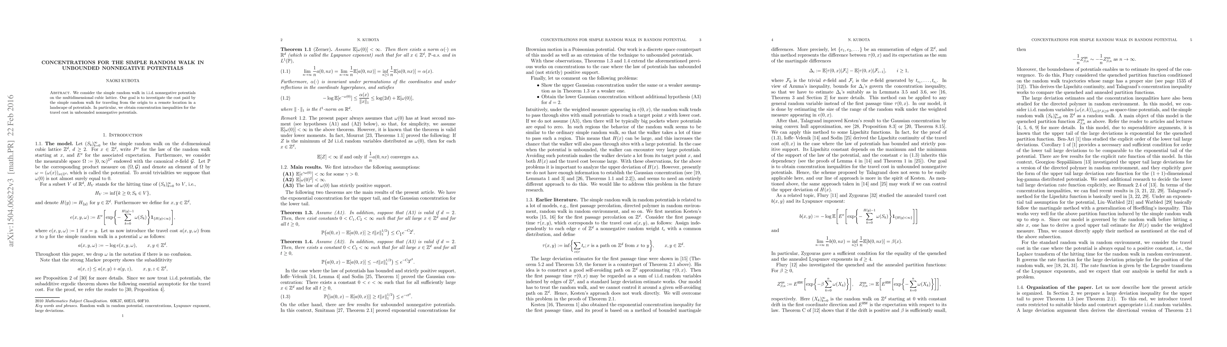 We consider the simple random walk in i.i.d. nonnegative potentials on the multidimensional cubic lattice. Our goal is to investigate the cost paid by the simple random walk for traveling from the origin to a remote location in a landscape of potentials. In particular, we obtain concentration inequalities for the travel cost in unbounded nonnegative potentials.