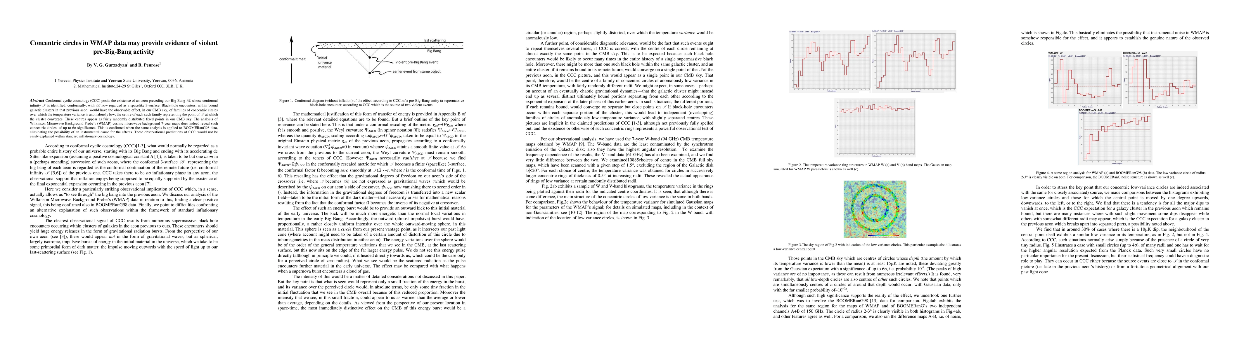 The paper suggests that concentric circles in WMAP data indicate pre-Big-Bang cosmic activity, supporting conformal cyclic cosmology. These circles, observed in CMB sky, are linked to black-hole encounters in previous aeons, providing evidence that challenges standard inflationary cosmology.