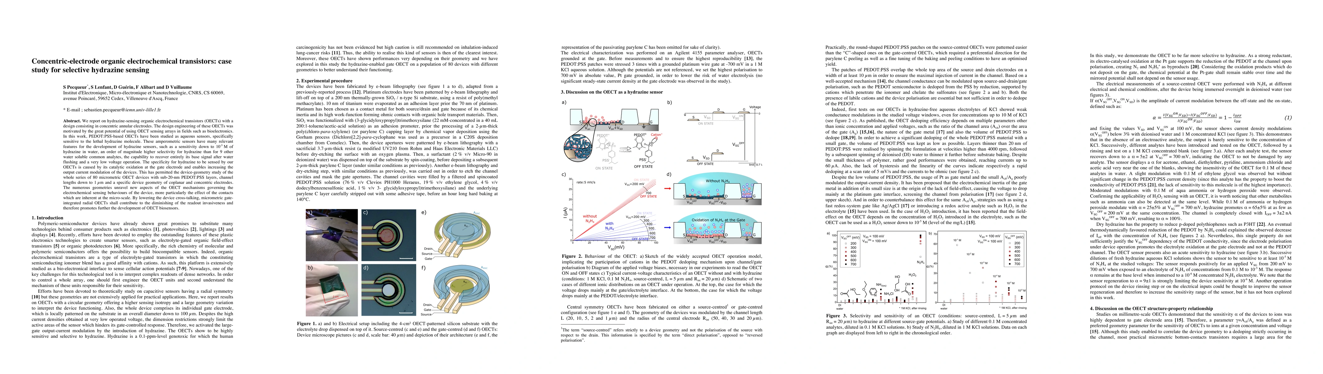 We report on hydrazine-sensing organic electrochemical transistors (OECTs) with a design consisting in concentric annular electrodes. The design engineering of these OECTs was motivated by the great potential of using OECT sensing arrays in fields such as bioelectronics. In this work, PEDOT:PSS-based OECTs have been studied as aqueous sensors, specifically sensitive to the lethal hydrazine molecule. These amperometric sensors have many relevant features for the development of hydrazine sensors, such as a sensitivity down to 10-5 M of hydrazine in water, an order of magnitude higher selectivity for hydrazine than for 9 other water soluble common analytes, the capability to recover entirely its base signal after water flushing and a very low voltage operation. The specificity for hydrazine to be sensed by our OECTs is caused by its catalytic oxidation at the gate electrode and enables increasing the output current modulation of the devices. This has permitted the device-geometry study of the whole series of 80 micrometric OECT devices with sub-20-nm PEDOT:PSS layers, channel lengths down to 1um and a specific device geometry of coplanar and concentric electrodes. The numerous geometries unravel new aspects of the OECT mechanisms governing the electrochemical sensing behaviours of the device, more particularly the effect of the contacts which are inherent at the micro-scale. By lowering the device cross-talking, micrometric gate-integrated radial OECTs shall contribute to the diminishing of the readout invasiveness and therefore promotes further the development of OECT biosensors.
