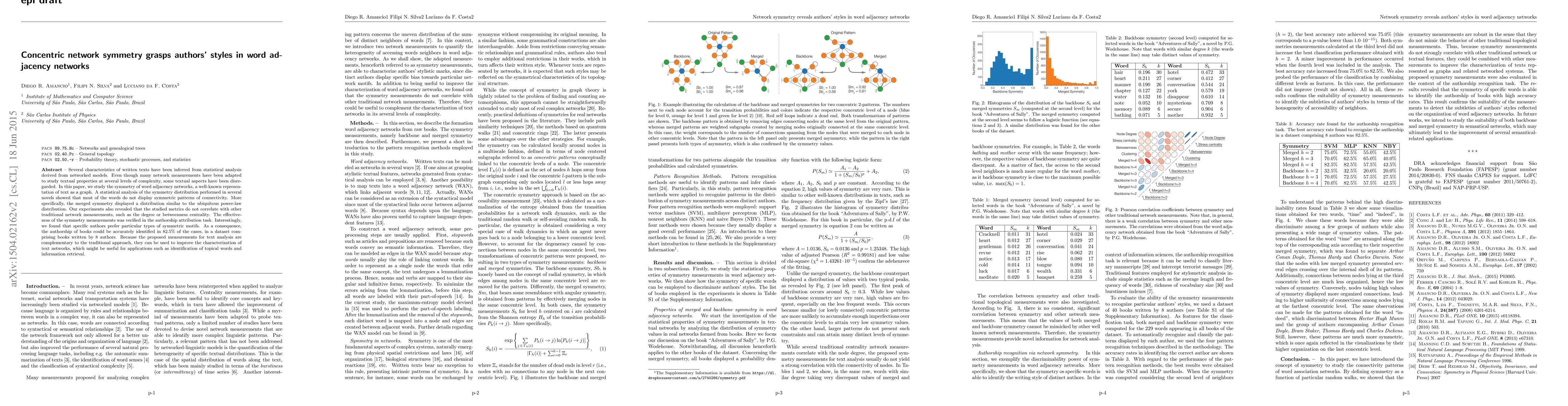 Several characteristics of written texts have been inferred from statistical analysis derived from networked models. Even though many network measurements have been adapted to study textual properties at several levels of complexity, some textual aspects have been disregarded. In this paper, we study the symmetry of word adjacency networks, a well-known representation of text as a graph. A statistical analysis of the symmetry distribution performed in several novels showed that most of the words do not display symmetric patterns of connectivity. More specifically, the merged symmetry displayed a distribution similar to the ubiquitous power-law distribution. Our experiments also revealed that the studied metrics do not correlate with other traditional network measurements, such as the degree or betweenness centrality. The effectiveness of the symmetry measurements was verified in the authorship attribution task. Interestingly, we found that specific authors prefer particular types of symmetric motifs. As a consequence, the authorship of books could be accurately identified in 82.5% of the cases, in a dataset comprising books written by 8 authors. Because the proposed measurements for text analysis are complementary to the traditional approach, they can be used to improve the characterization of text networks, which might be useful for related applications, such as those relying on the identification of topical words and information retrieval.
