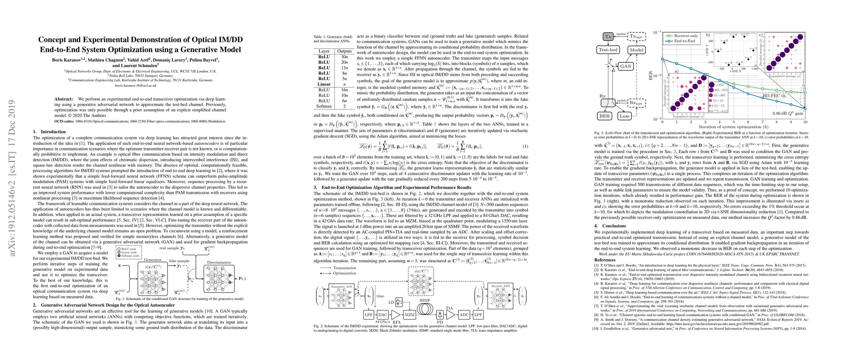 This paper demonstrates an end-to-end optimization of an optical IM/DD system using a generative adversarial network for deep learning, eliminating the need for simplified channel models and enabling real-time adaptation to actual channel conditions. Experimental results validate the effectiveness of this approach in optimizing the transceiver performance.