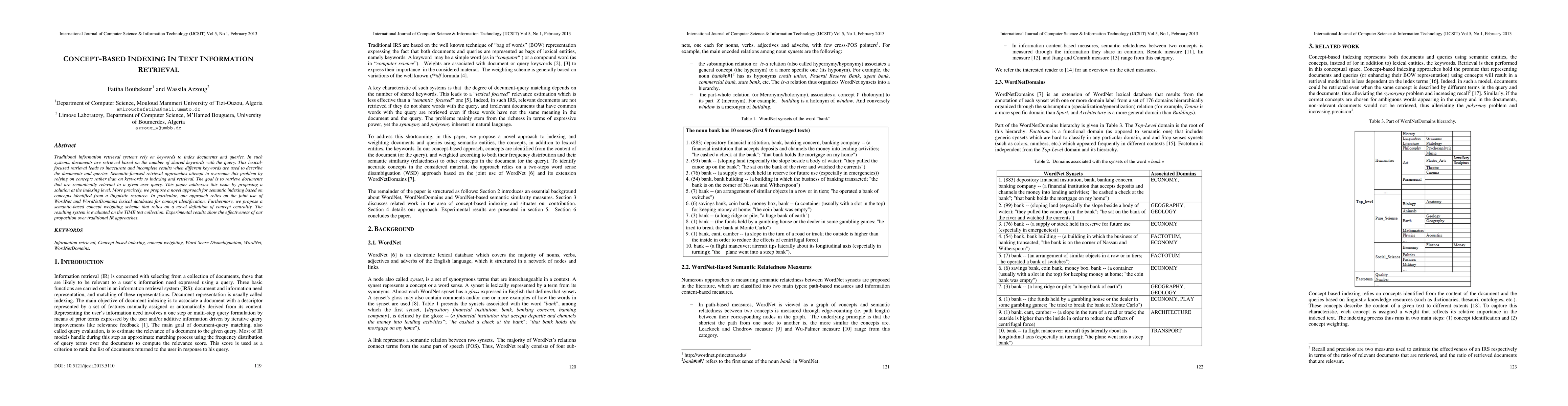 This paper proposes a novel semantic-based indexing approach using concepts identified from WordNet and WordNetDomains to improve text retrieval accuracy. The method employs a new concept weighting scheme based on concept centrality, demonstrating superior performance over traditional keyword-based retrieval systems in evaluations using the TIME test collection.