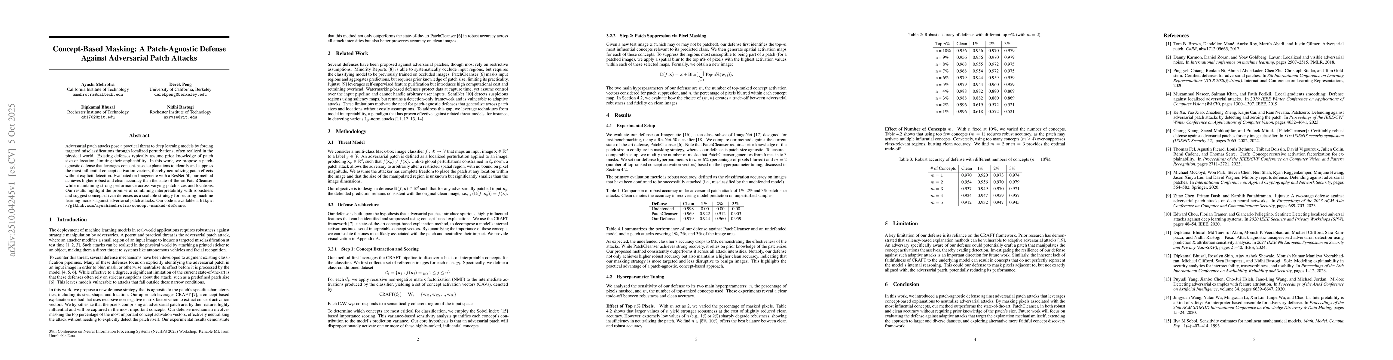 Introduces a concept-based masking technique that uses interpretable concept vectors to suppress adversarial patch influence, achieving robustness without requiring prior knowledge of patch characteristics.